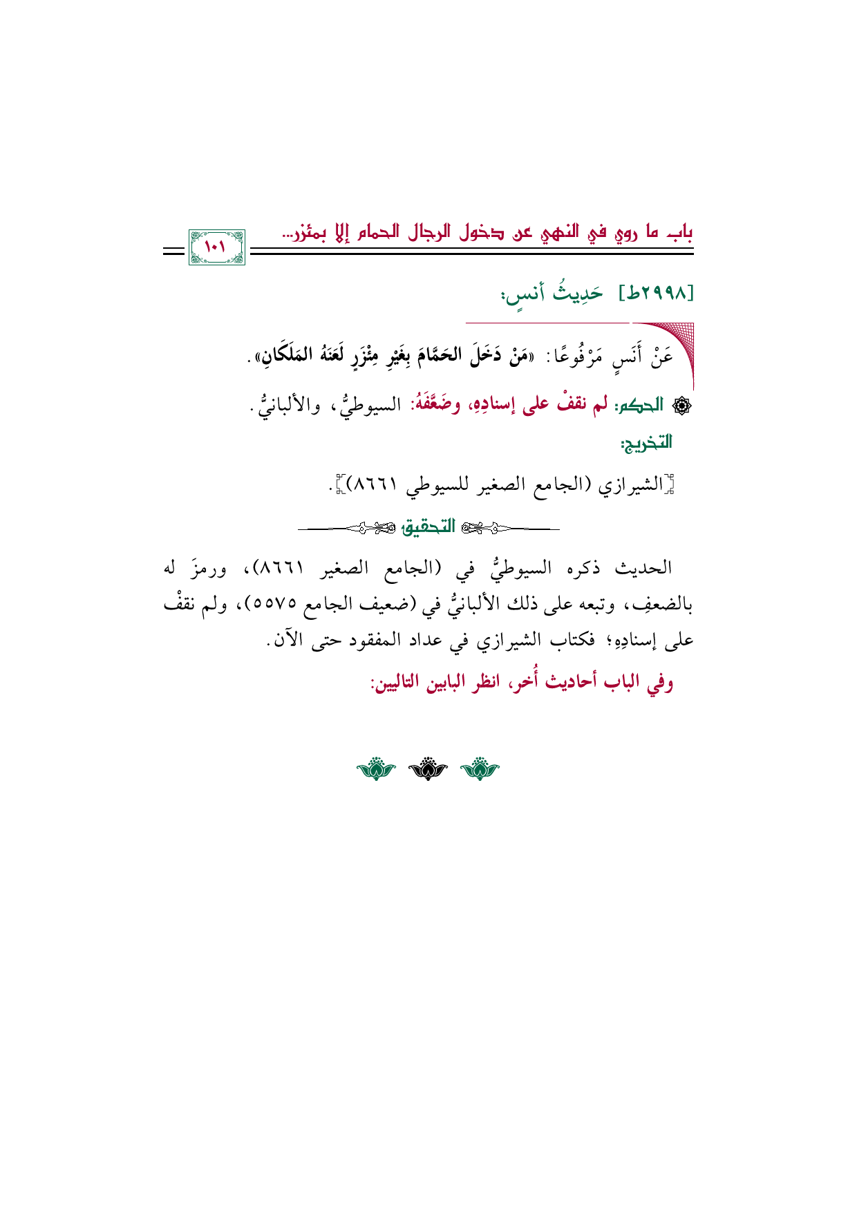[الحكم]: لم نقفْ على إسنادِهِ، وضَعَّفَهُ: السيوطيُّ، والألبانيُّ.