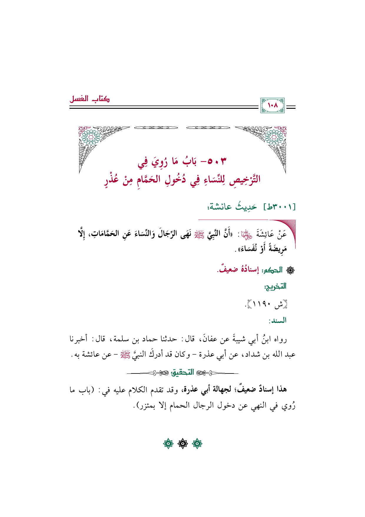 ٥٠٣ - بَابُ مَا رُوِيَ فِي التَّرْخِيصِ لِلنِّسَاءِ فِي دُخُولِ الحَمَّامِ مِنْ عُذْرٍ