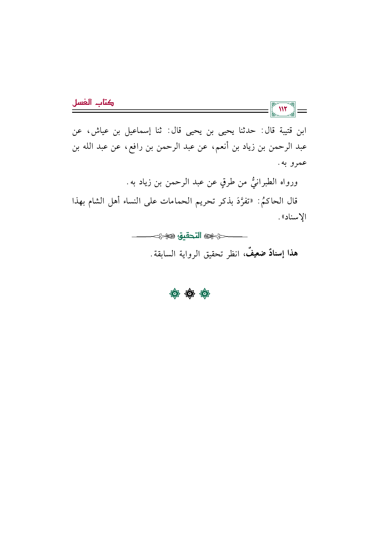 قال الحاكمُ: "تفرَّدَ بذكر تحريم الحمامات على النساء أهل الشام بهذا الإسناد".