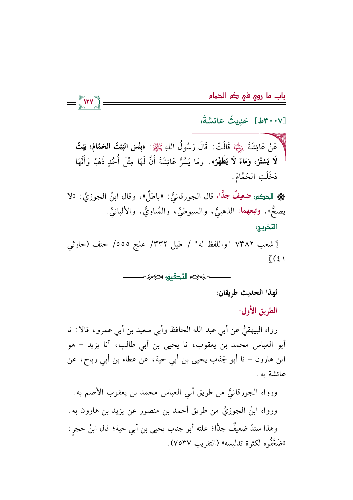 رواه البيهقيُّ عن أبي عبد الله الحافظ وأبي سعيد بن أبي عمرو، قالا: نا أبو العباس محمد بن يعقوب، نا يحيى بن أبي طالب، أنا يزيد -هو ابن هارون- نا أبو جَنَاب يحيى بن أبي حية، عن عطاء بن أبي رباح، عن عائشة به.
