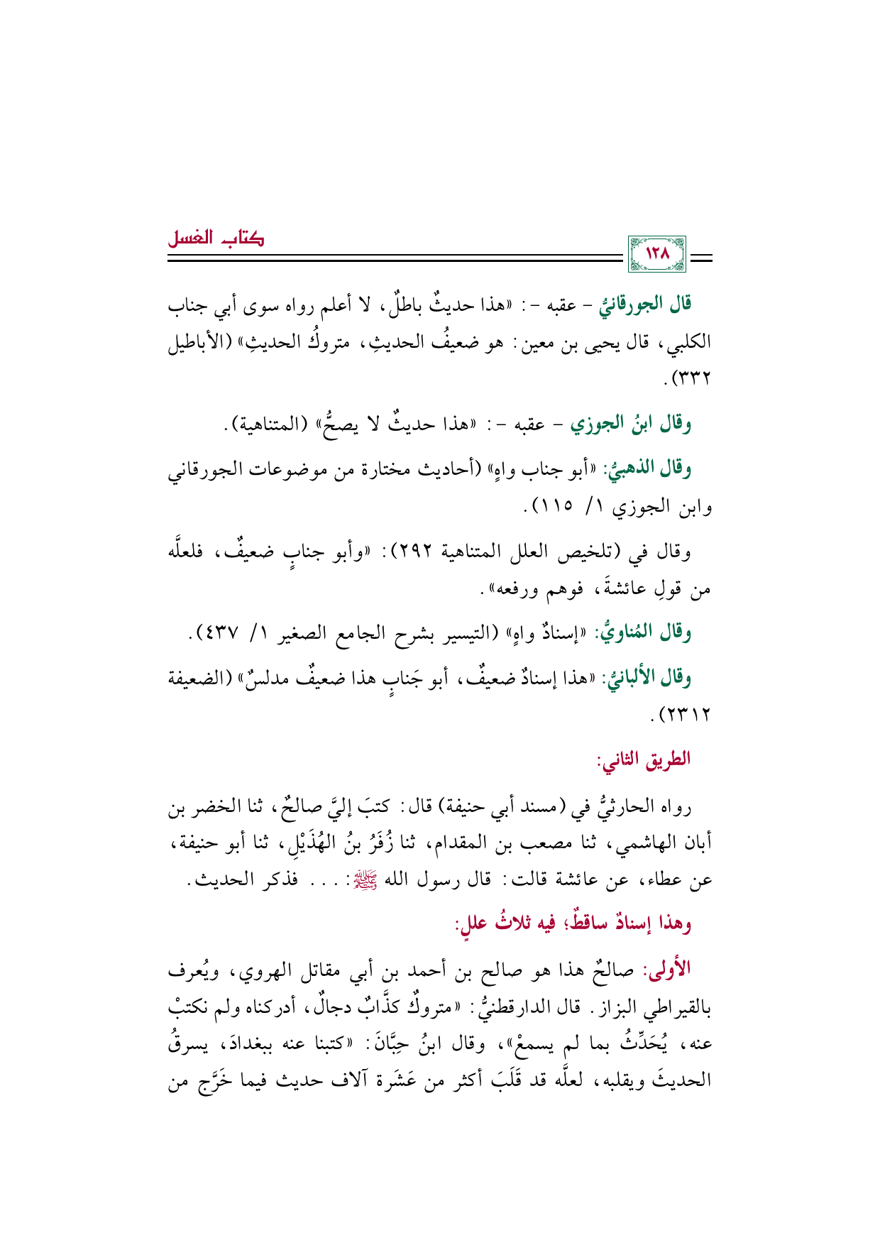 وقال في (تلخيص العلل المتناهية ٢٩٢): "وأبو جنابٍ ضعيفٌ، فلعلَّه من قولِ عائشةَ، فوهم ورفعه".