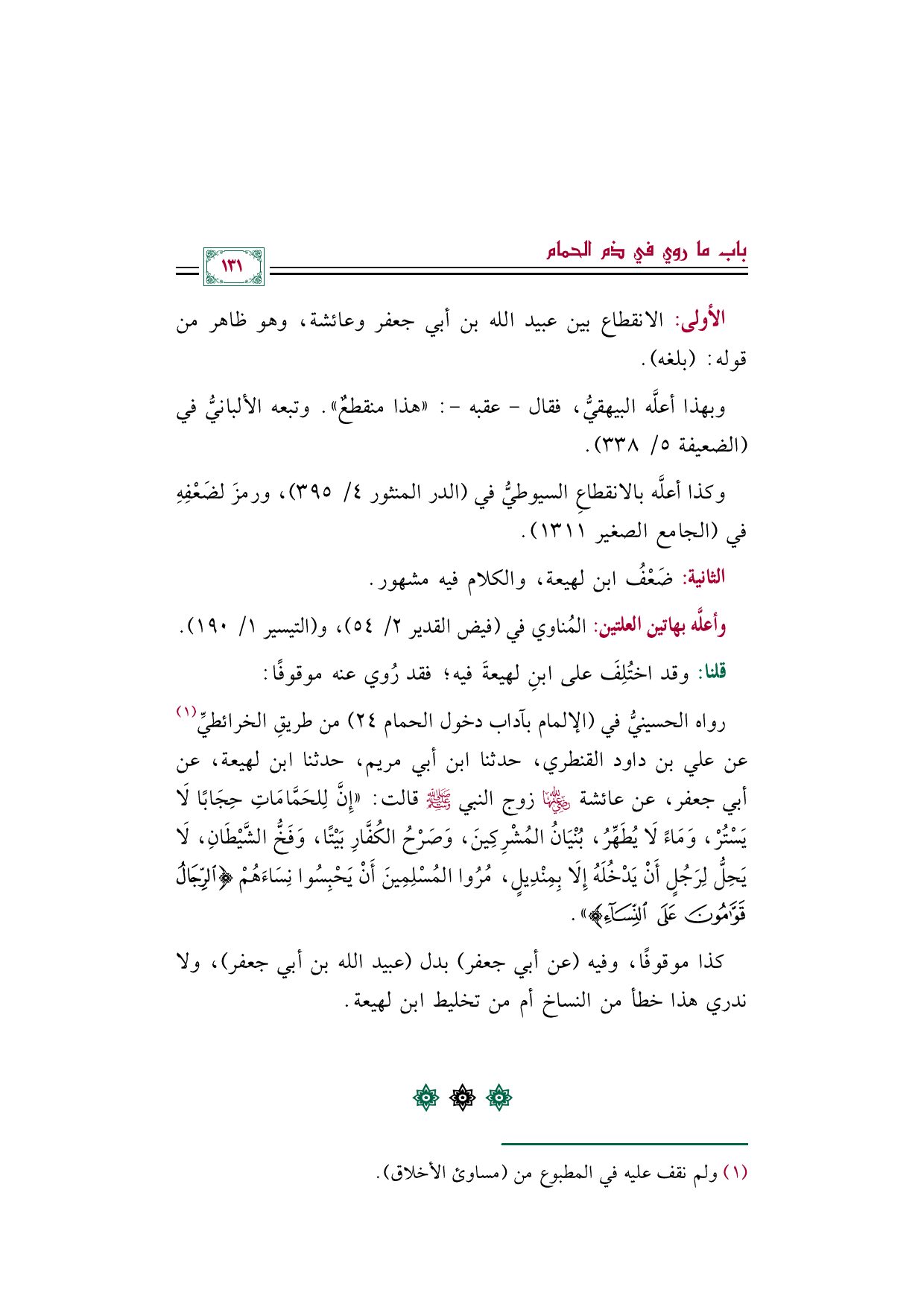 رواه الحسينيُّ في (الإلمام بآداب دخول الحمام ٢٤) من طريقِ الخرائطيِّ (¬١) عن علي بن داود القنطري، حدثنا ابن أبي مريم، حدثنا ابن لهيعة، عن أبي جعفر، عن عائشة رضي الله عنها زوج النبي صلى الله عليه وسلم قالت: ((إِنَّ لِلحَمَّامَاتِ حِجَابًا لَا يَسْتُرْ، وَمَاءً لَا يُطَهِّرُ، بُنْيَانُ المُشْرِكِينَ، وَصَرْحُ الكُفَّارِ بَيْتًا، وَفَخُّ الشَّيْطَانِ، لَا يَحِلُّ لِرَجُلٍ أَنْ يَدْخُلَهُ إِلَا بِمِنْدِيلٍ، مُرُوا المُسْلِمِينَ أَنْ يَحْبِسُوا نِسَاءَهُمْ {الرِّجَالُ قَوَّامُونَ عَلَى النِّسَاءِ})).