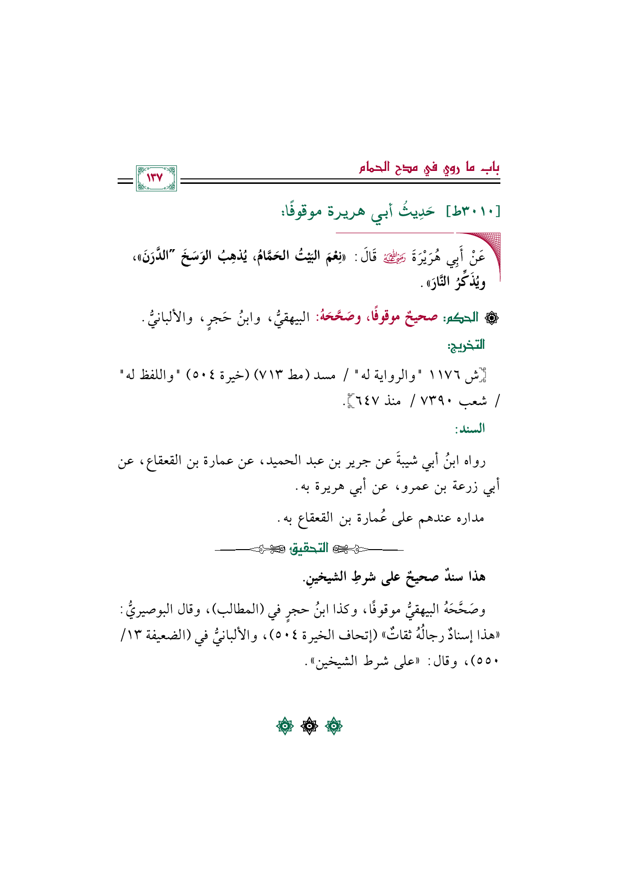 ◼ عَنْ أَبِي هُرَيْرَةَ رضي الله عنه قَالَ: ((نِعْمَ البَيْتُ الحَمَّامُ، يُذهِبُ الوَسَخَ (الدَّرَنَ)، ويُذَكِّرُ النَّارَ)).