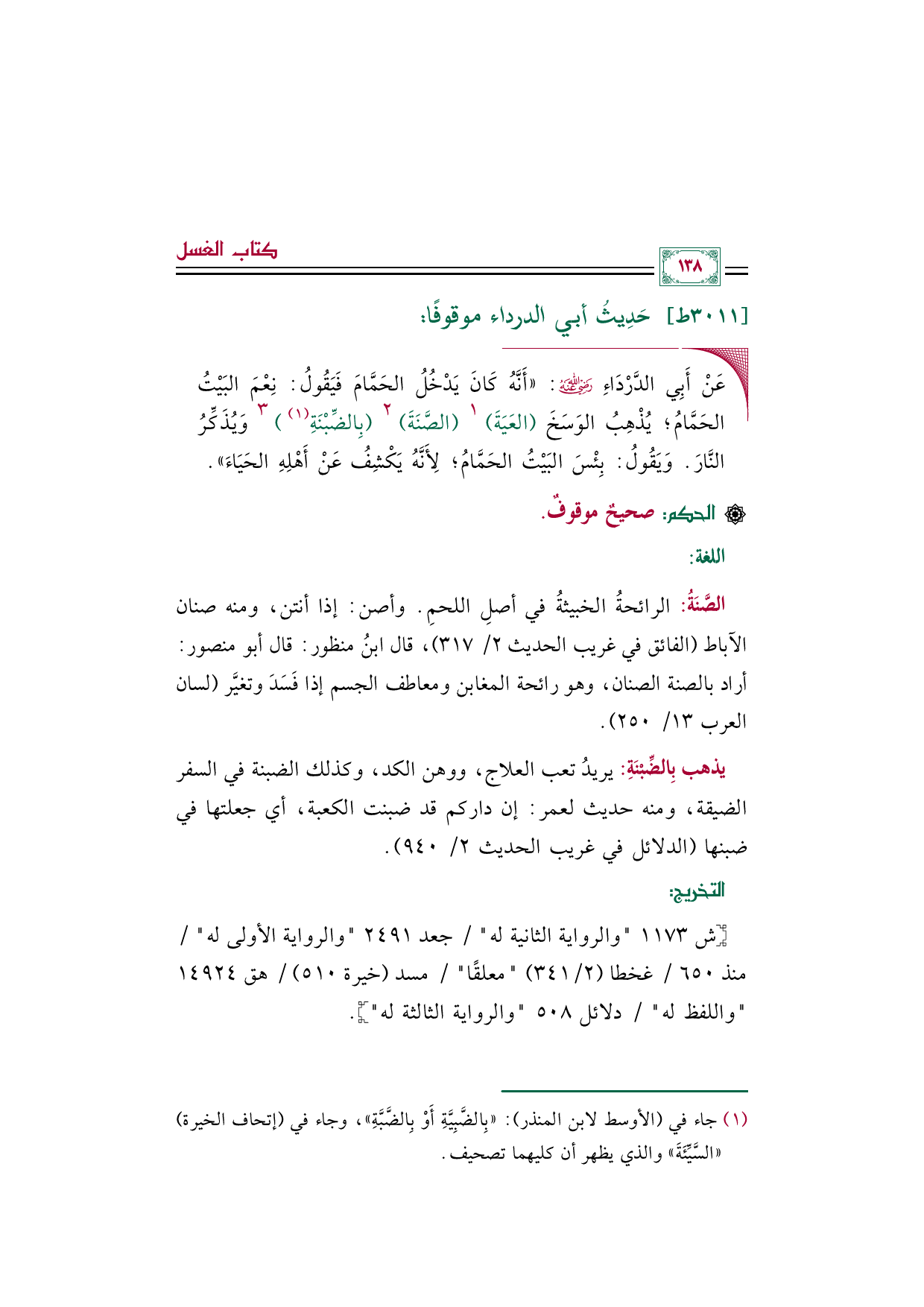 (¬١) جاء في (الأوسط لابن المنذر): «بِالضَّبِيَّةِ أَوْ بِالضَّبَّةِ»، وجاء في (إتحاف الخيرة) «السَّيِّئَةَ» والذي يظهر أن كليهما تصحيف.