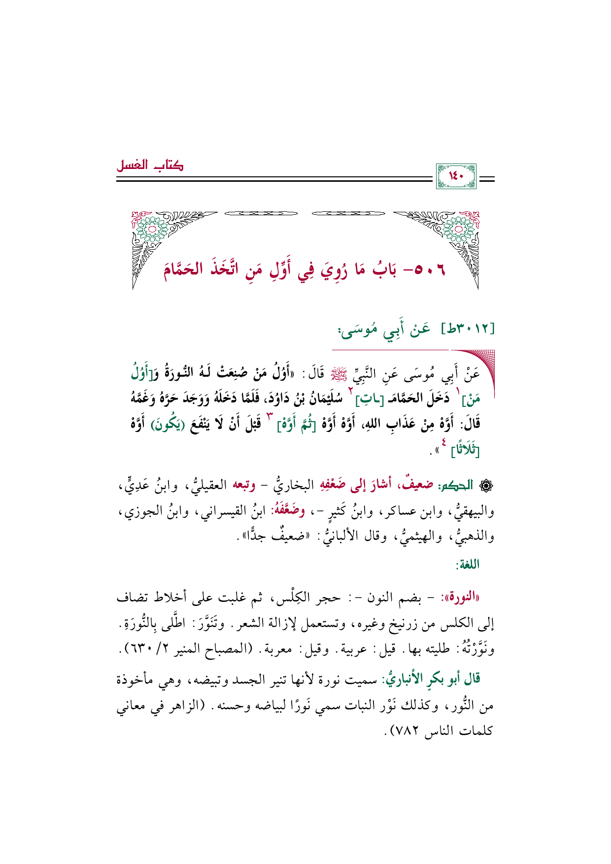 [اللغة]: ((النورة)): -بضم النون-: حجر الكِلْس، ثم غلبت على أخلاط تضاف إلى الكلس من زرنيخ وغيره، وتستعمل لإزالة الشعر. وتَنَوَّرَ: اطَّلى بِالنُّورَةِ. ونَوَّرْتُهُ: طليته بها. قيل: عربية. وقيل: معربة. (المصباح المنير ٢/ ٦٣٠).