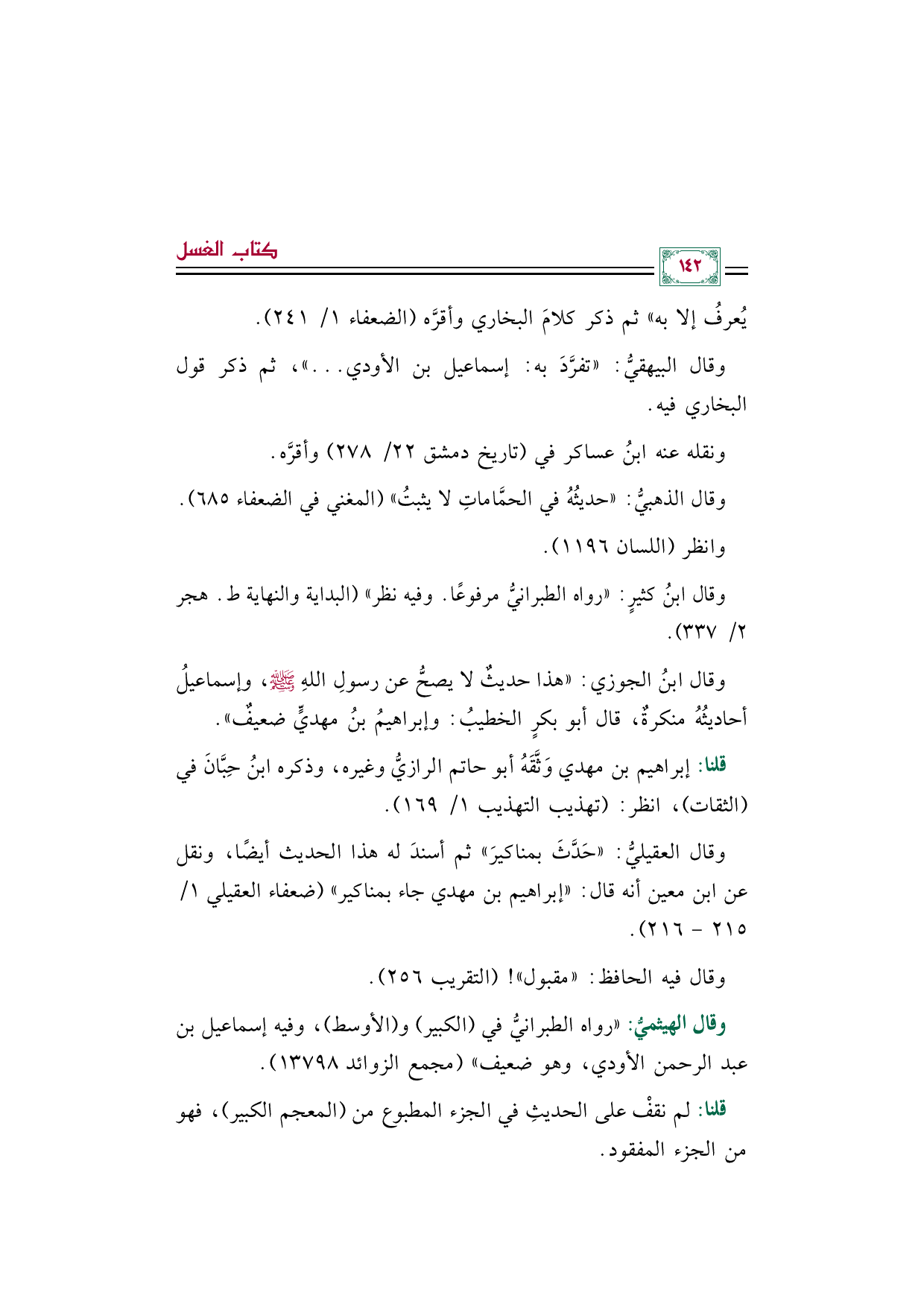 وقال الذهبيُّ: "حديثُهُ في الحمَّاماتِ لا يثبتُ" (المغني في الضعفاء ٦٨٥).