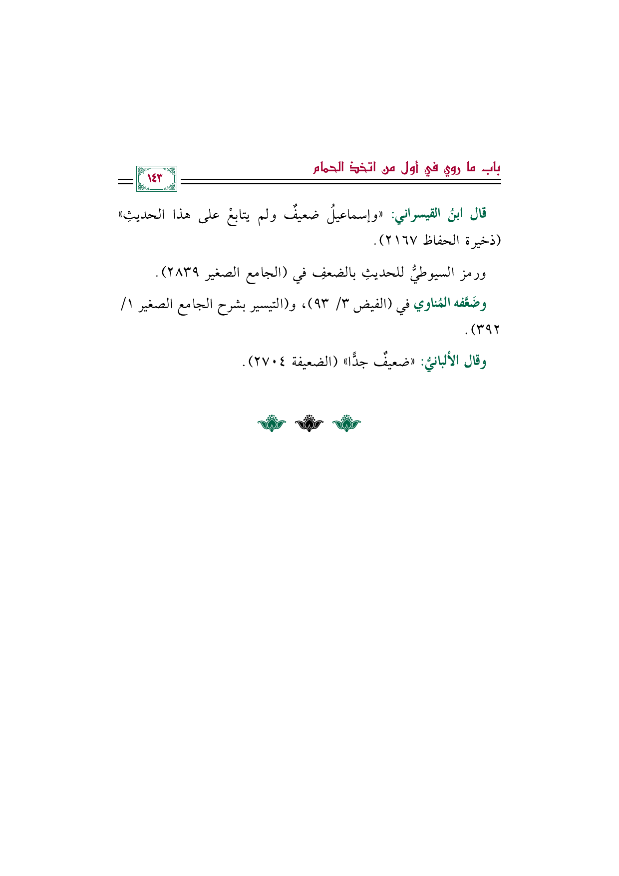 قال ابنُ القيسراني: "وإسماعيلُ ضعيفٌ ولم يتابعْ على هذا الحديثِ" (ذخيرة الحفاظ ٢١٦٧).