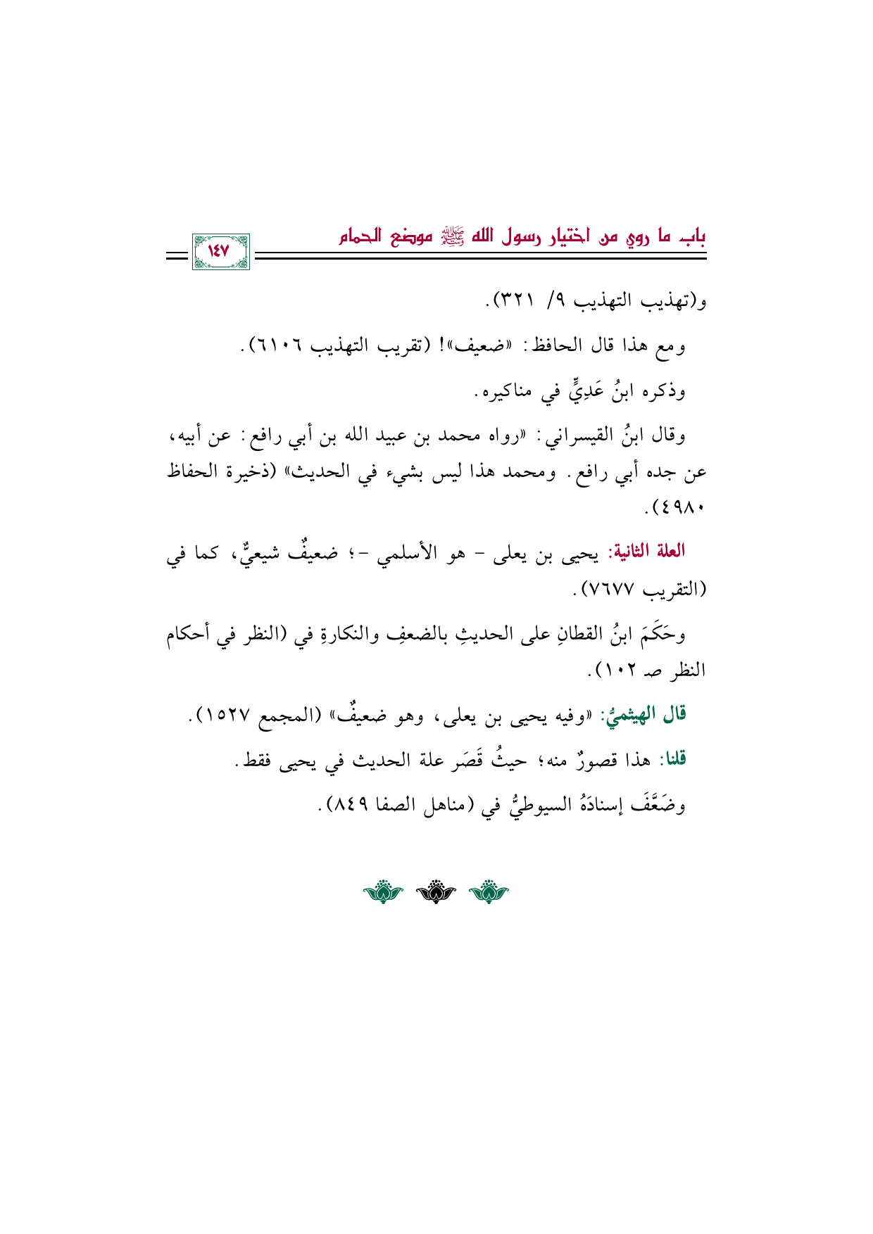 العلة الثانية: يحيى بن يعلى -هو الأسلمي-؛ ضعيفٌ شيعيٌّ، كما في (التقريب ٧٦٧٧).