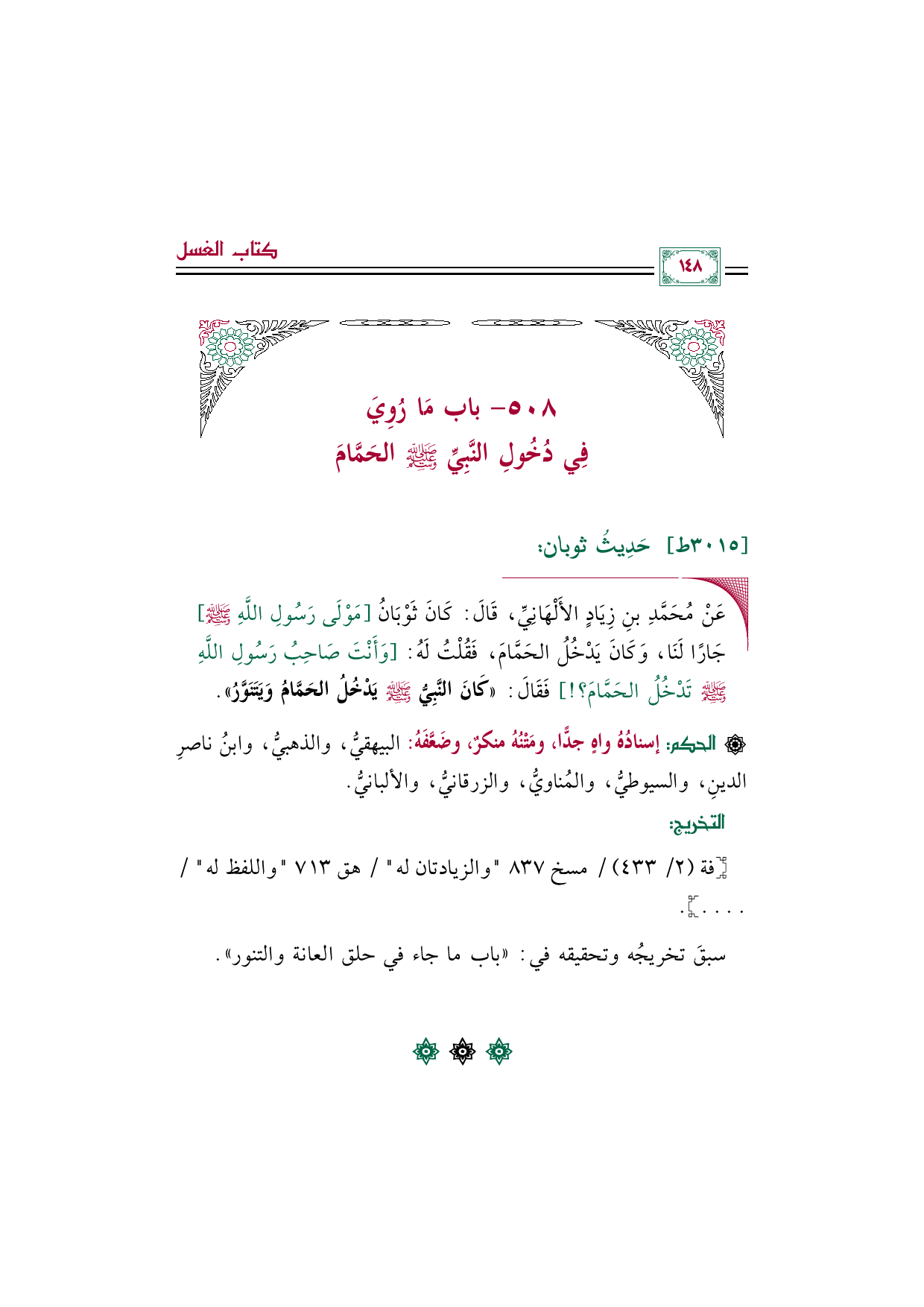 ٥٠٨ - باب مَا رُوِيَ فِي دُخُولِ النَّبِيِّ صلى الله عليه وسلم الحَمَّامَ