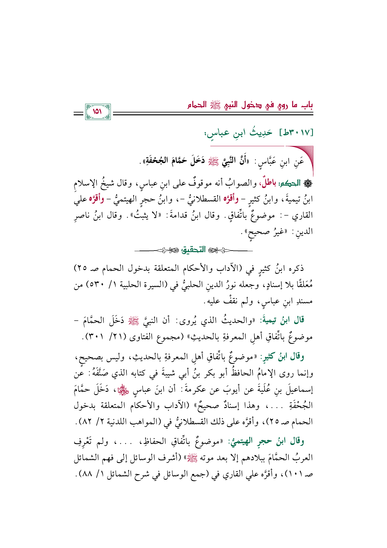 وقال ابنُ كثيرٍ: "موضوعٌ باتِّفاقِ أهلِ المعرفةِ بالحديثِ، وليس بصحيحٍ، وإنما روى الإمامُ الحافظُ أبو بكر بنُ أبي شيبةَ في كتابه الذي صَنَّفَهُ: عن إسماعيلَ بنِ عُلَيةَ عن أيوبَ عن عكرمةَ: أن ابنَ عباسٍ رضي الله عنهما، دَخَلَ حمَّامَ الجُحْفَةِ ... ، وهذا إسنادٌ صحيحٌ" (الآداب والأحكام المتعلقة بدخول الحمام صـ ٢٥)، وأقرَّه على ذلك القسطلانيُّ في (المواهب اللدنية ٢/ ٨٢).