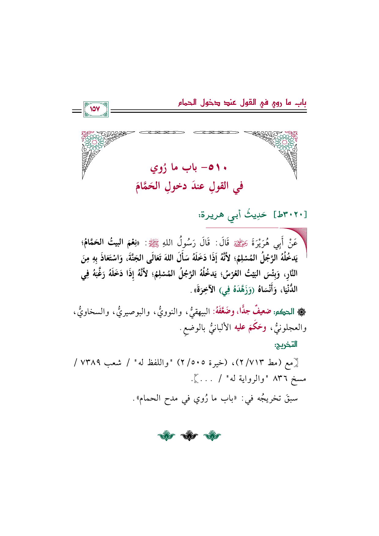 ◼ عَنْ أَبِي هُرَيْرَةَ رضي الله عنه قَالَ: قَالَ رَسُولُ اللهِ صلى الله عليه وسلم: ((نِعْمَ البيتُ الحَمَّامُ؛ يَدخُلُهُ الرَّجُلُ المُسْلِمُ؛ لأنَّهُ إَذَا دَخَلَهُ سَأَلَ اللهَ تَعَالَى الجَنَّةَ، وَاسْتَعَاذَ بِهِ مِنَ النَّارِ، وَبِئْسَ البَيْتُ العُرْسُ؛ يَدخُلُهُ الرَّجُلُ المُسْلِمُ؛ لأنَّهُ إِذَا دَخَلَهُ رَغَّبَهُ فِي الدُّنْيَا، وَأَنْسَاهُ (وَزَهَّدَهُ فِي) الآخِرَةَ)).