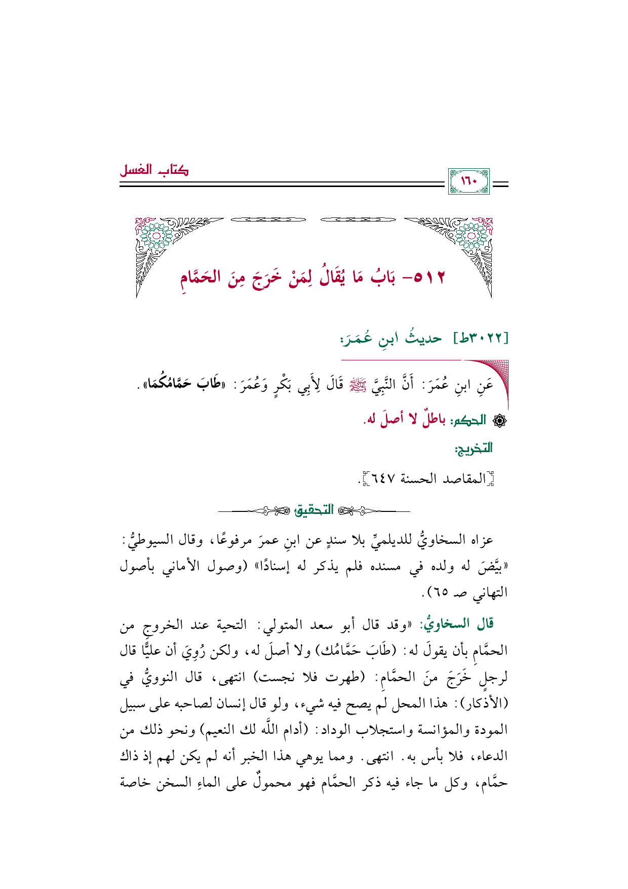 قال السخاويُّ: "وقد قال أبو سعد المتولي: التحية عند الخروجِ من الحمَّامِ بأن يقولَ له: (طَابَ حَمَّامُك) ولا أصلَ له، ولكن رُوِيَ أن عليًّا قال لرجلٍ خَرَجَ منَ الحمَّامِ: (طهرت فلا نجست) انتهى، قال النوويُّ في (الأذكار): هذا المحل لم يصح فيه شيء، ولو قال إنسان لصاحبه على سبيل المودة والمؤانسة واستجلاب الوداد: (أدام اللَّه لك النعيم) ونحو ذلك من الدعاء، فلا بأس به. انتهى. ومما يوهي هذا الخبر أنه لم يكن لهم إذ ذاك حمَّام، وكل ما جاء فيه ذكر الحمَّام فهو محمولٌ على الماءِ السخن خاصة