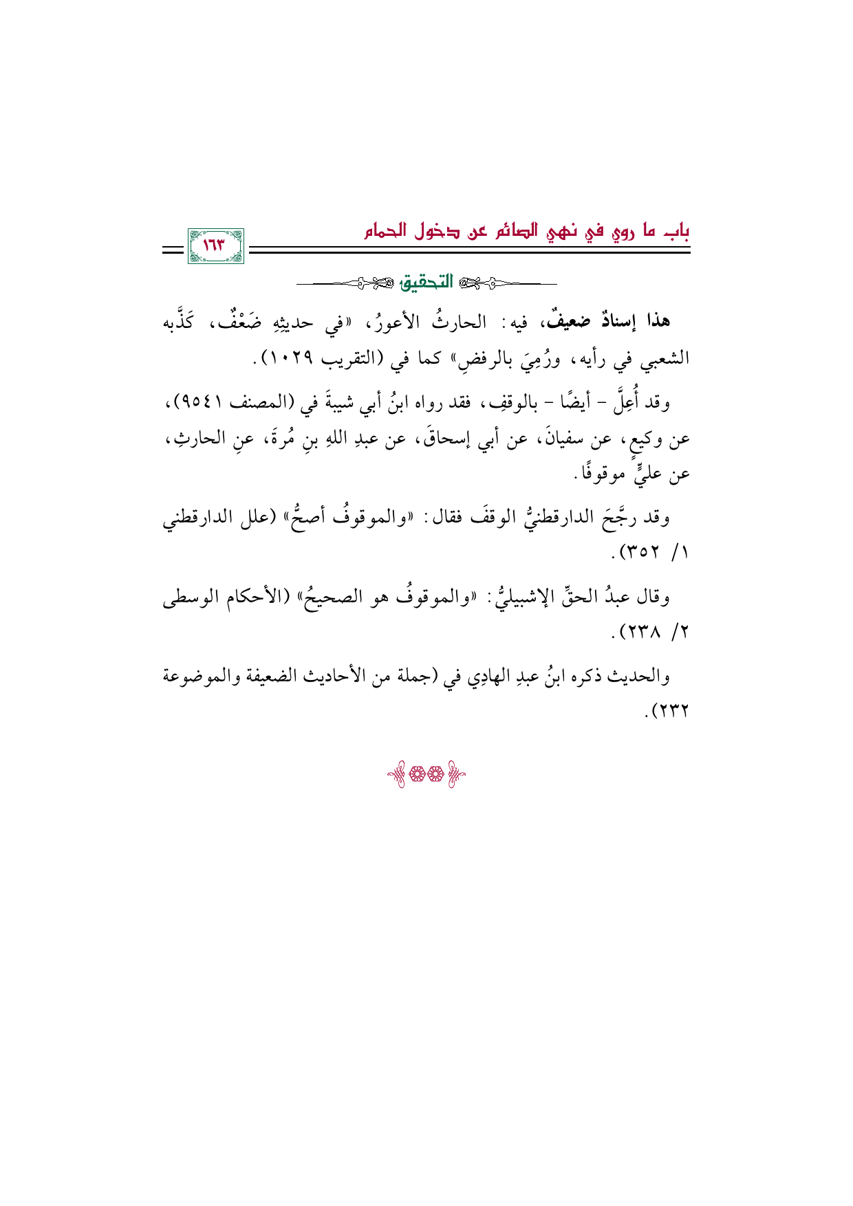 وقد أُعِلَّ -أيضًا- بالوقفِ، فقد رواه ابنُ أبي شيبةَ في (المصنف ٩٥٤١)، عن وكيعٍ، عن سفيانَ، عن أبي إسحاقَ، عن عبدِ اللهِ بنِ مُرةَ، عنِ الحارثِ، عن عليٍّ موقوفًا.