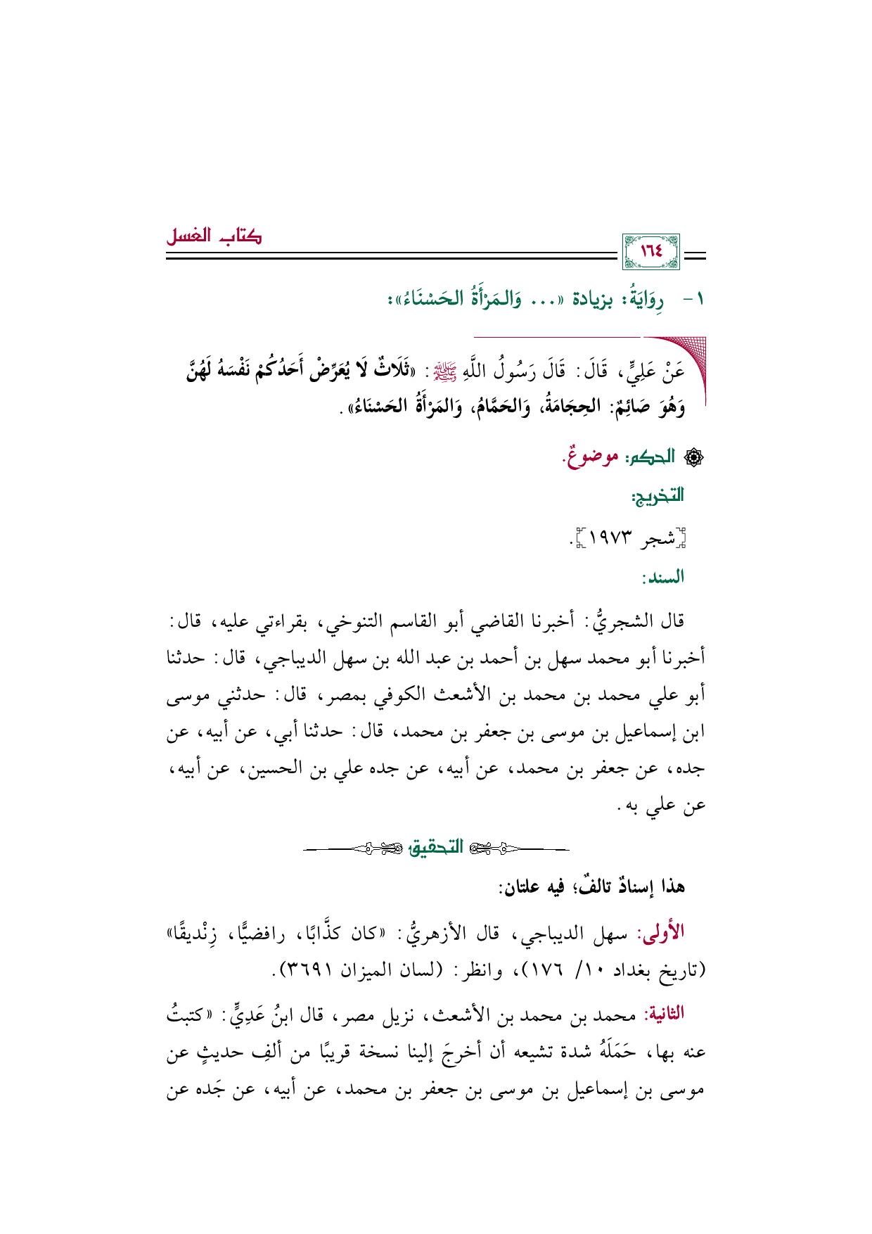قال الشجريُّ: أخبرنا القاضي أبو القاسم التنوخي، بقراءتي عليه، قال: أخبرنا أبو محمد سهل بن أحمد بن عبد الله بن سهل الديباجي، قال: حدثنا أبو علي محمد بن محمد بن الأشعث الكوفي بمصر، قال: حدثني موسى بن إسماعيل بن موسى بن جعفر بن محمد، قال: حدثنا أبي، عن أبيه، عن جده، عن جعفر بن محمد، عن أبيه، عن جده علي بن الحسين، عن أبيه، عن علي به.