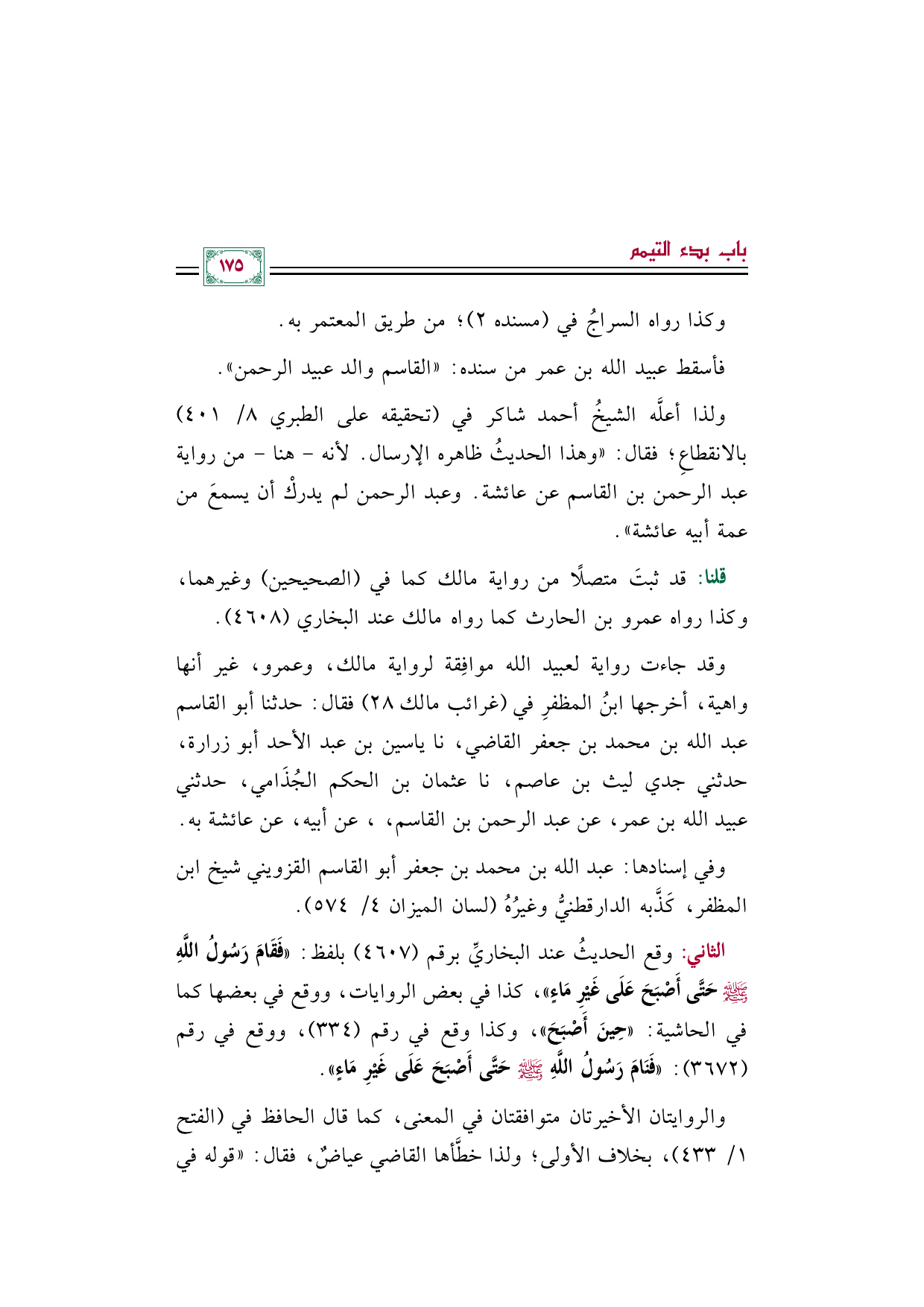 الثاني: وقع الحديثُ عند البخاريِّ برقم (٤٦٠٧) بلفظ: ((فَقَامَ رَسُولُ اللَّهِ صلى الله عليه وسلم حَتَّى أَصْبَحَ عَلَى غَيْرِ مَاءٍ))، كذا في بعض الروايات، ووقع في بعضها كما في الحاشية: ((حِينَ أَصْبَحَ))، وكذا وقع في رقم (٣٣٤)، ووقع في رقم (٣٦٧٢): ((فَنَامَ رَسُولُ اللَّهِ صلى الله عليه وسلم حَتَّى أَصْبَحَ عَلَى غَيْرِ مَاءٍ)).