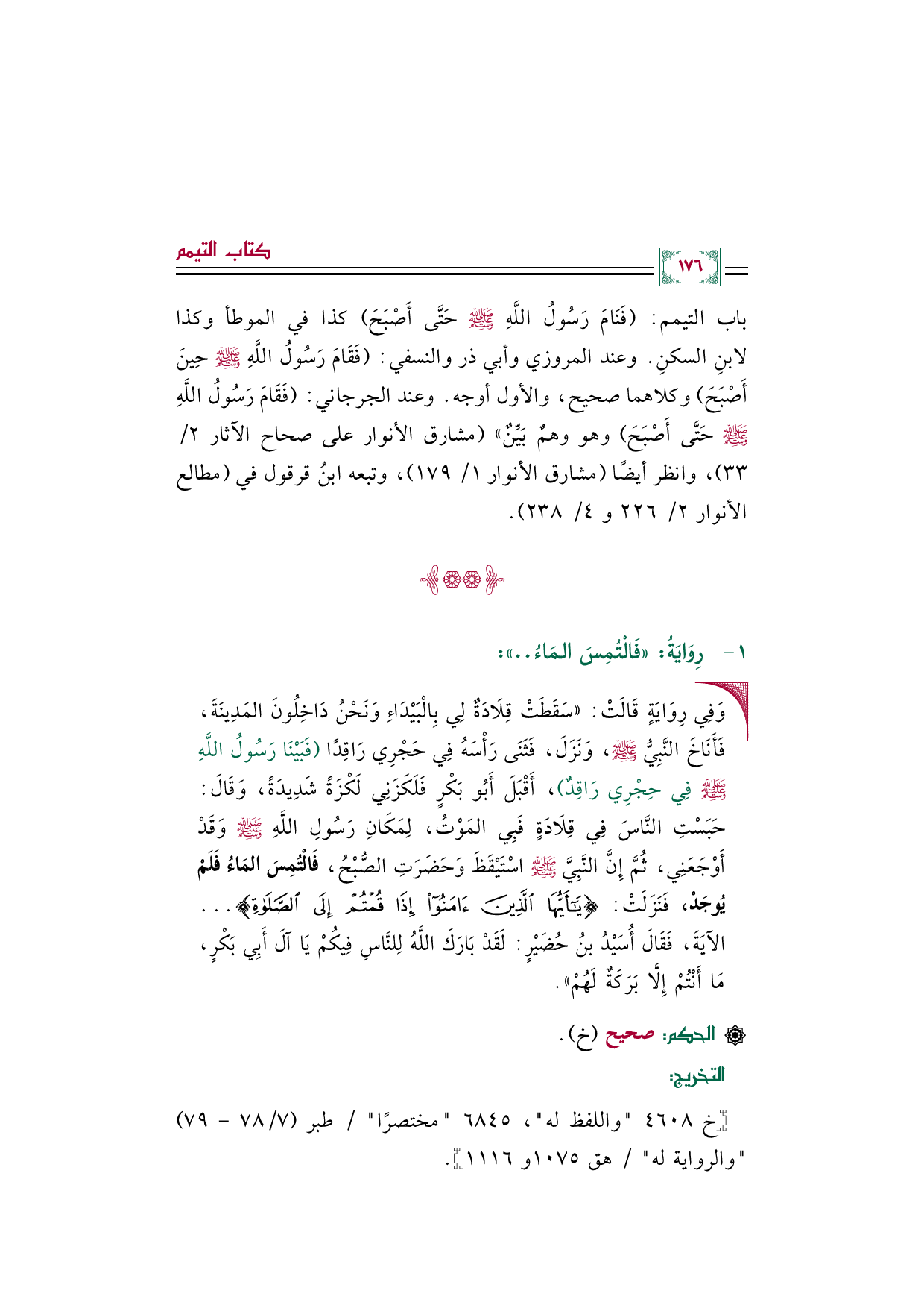 • وَفِي رِوَايَةٍ قَالَتْ: ((سَقَطَتْ قِلَادَةٌ لِي بِالْبَيْدَاءِ وَنَحْنُ دَاخِلُونَ المَدِينَةَ، فَأَنَاخَ النَّبِيُّ صلى الله عليه وسلم، وَنَزَلَ، فَثَنَى رَأْسَهُ فِي حَجْرِي رَاقِدًا (فَبَيْنَا رَسُولُ اللَّهِ صلى الله عليه وسلم فِي حِجْرِي رَاقِدٌ)، أَقْبَلَ أَبُو بَكْرٍ فَلَكَزَنِي لَكْزَةً شَدِيدَةً، وَقَالَ: حَبَسْتِ النَّاسَ فِي قِلَادَةٍ فَبِي المَوْتُ، لِمَكَانِ رَسُولِ اللَّهِ صلى الله عليه وسلم وَقَدْ أَوْجَعَنِي، ثُمَّ إِنَّ النَّبِيَّ صلى الله عليه وسلم اسْتَيْقَظَ وَحَضَرَتِ الصُّبْحُ، فَالْتُمِسَ المَاءُ فَلَمْ يُوجَدْ، فَنَزَلَتْ: {يَا أَيُّهَا الَّذِينَ آمَنُوا إِذَا قُمْتُمْ إِلَى الصَّلاةِ ... الآيَةَ}، فَقَالَ أُسَيْدُ بنُ حُضَيْرٍ: لَقَدْ بَارَكَ اللَّهُ لِلنَّاسِ فِيكُمْ يَا آلَ أَبِي بَكْرٍ، مَا أَنْتُمْ إِلَّا بَرَكَةٌ لَهُمْ)).
