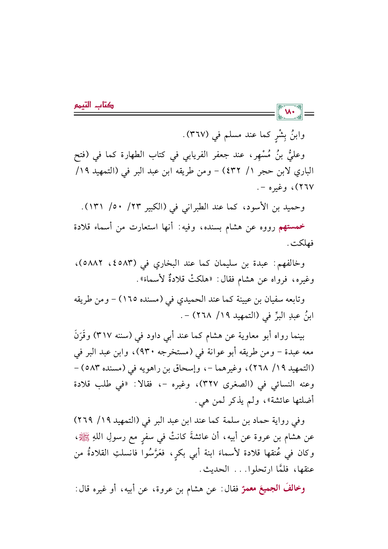 وفي رواية حماد بن سلمة كما عند ابن عبد البر في (التمهيد ١٩/ ٢٦٩) عن هشام بن عروة عن أبيه، أن عائشةَ كانتْ في سفرٍ مع رسولِ اللهِ صلى الله عليه وسلم، وكان في عُنقها قلادة لأسماءَ ابنة أبي بكرٍ، فعَرَّسُوا فانسلتِ القلادةُ من عنقها، فلمَّا ارتحلوا ... الحديث.