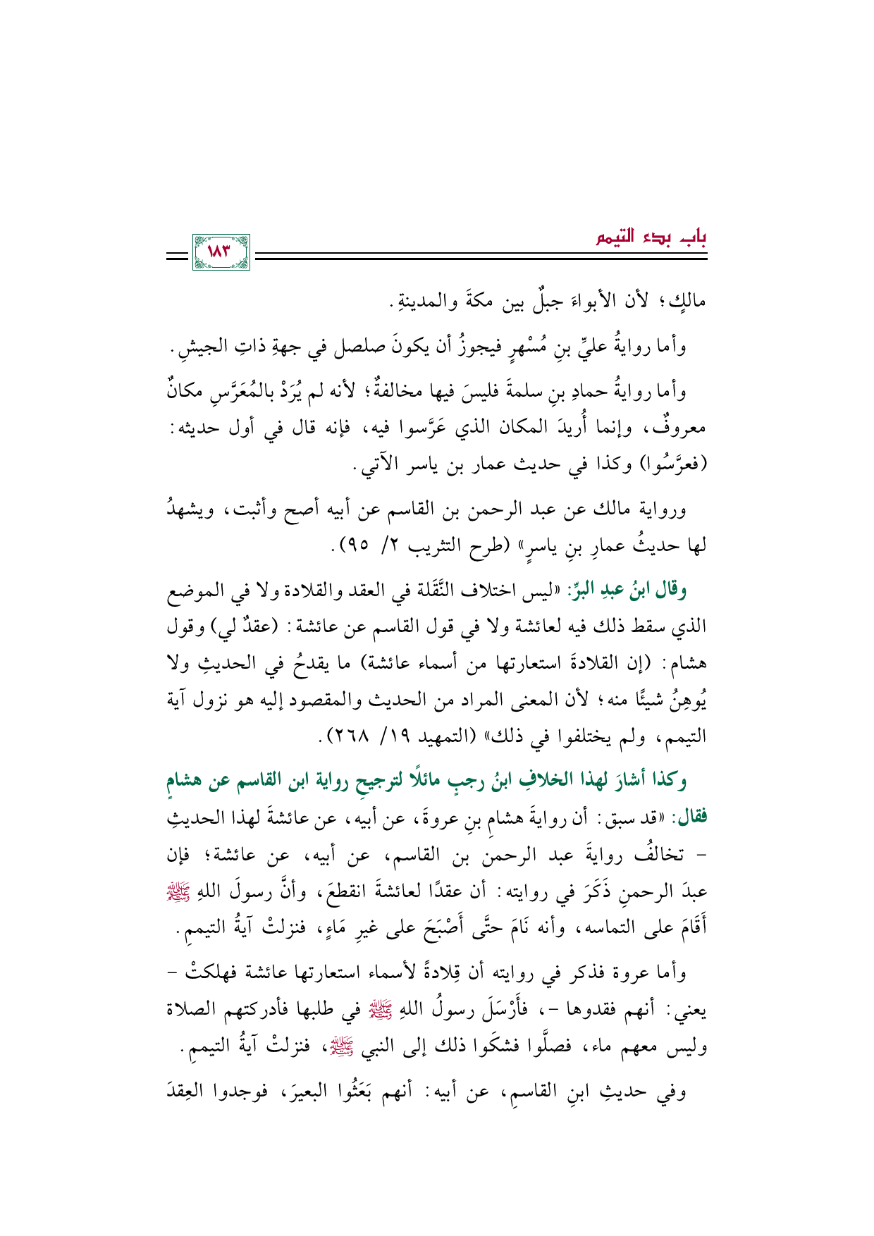 وكذا أشارَ لهذا الخلافِ ابنُ رجبٍ مائلًا لترجيحِ رواية ابن القاسم عن هشامٍ فقال: "قد سبق: أن روايةَ هشامِ بنِ عروةَ، عن أبيه، عن عائشةَ لهذا الحديثِ -تخالفُ روايةَ عبد الرحمن بن القاسم، عن أبيه، عن عائشة؛ فإن عبدَ الرحمنِ ذَكَرَ في روايته: أن عقدًا لعائشةَ انقطعَ، وأنَّ رسولَ اللهِ صلى الله عليه وسلم أَقَامَ على التماسه، وأنه نَامَ حتَّى أَصْبَحَ على غيرِ مَاءٍ، فنزلتْ آيةُ التيممِ.