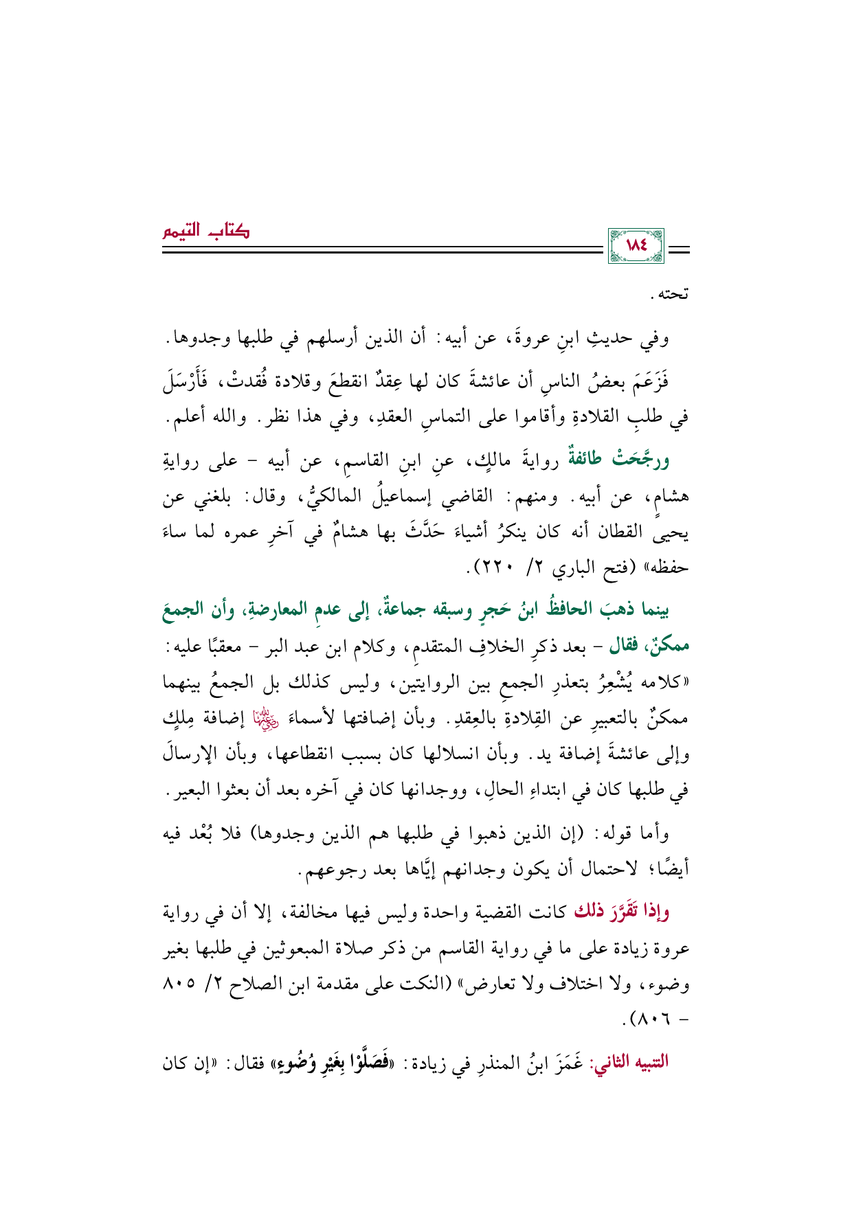 وإذا تَقَرَّرَ ذلك كانت القضية واحدة وليس فيها مخالفة، إلا أن في رواية عروة زيادة على ما في رواية القاسم من ذكر صلاة المبعوثين في طلبها بغير وضوء، ولا اختلاف ولا تعارض" (النكت على مقدمة ابن الصلاح ٢/ ٨٠٥ - ٨٠٦).