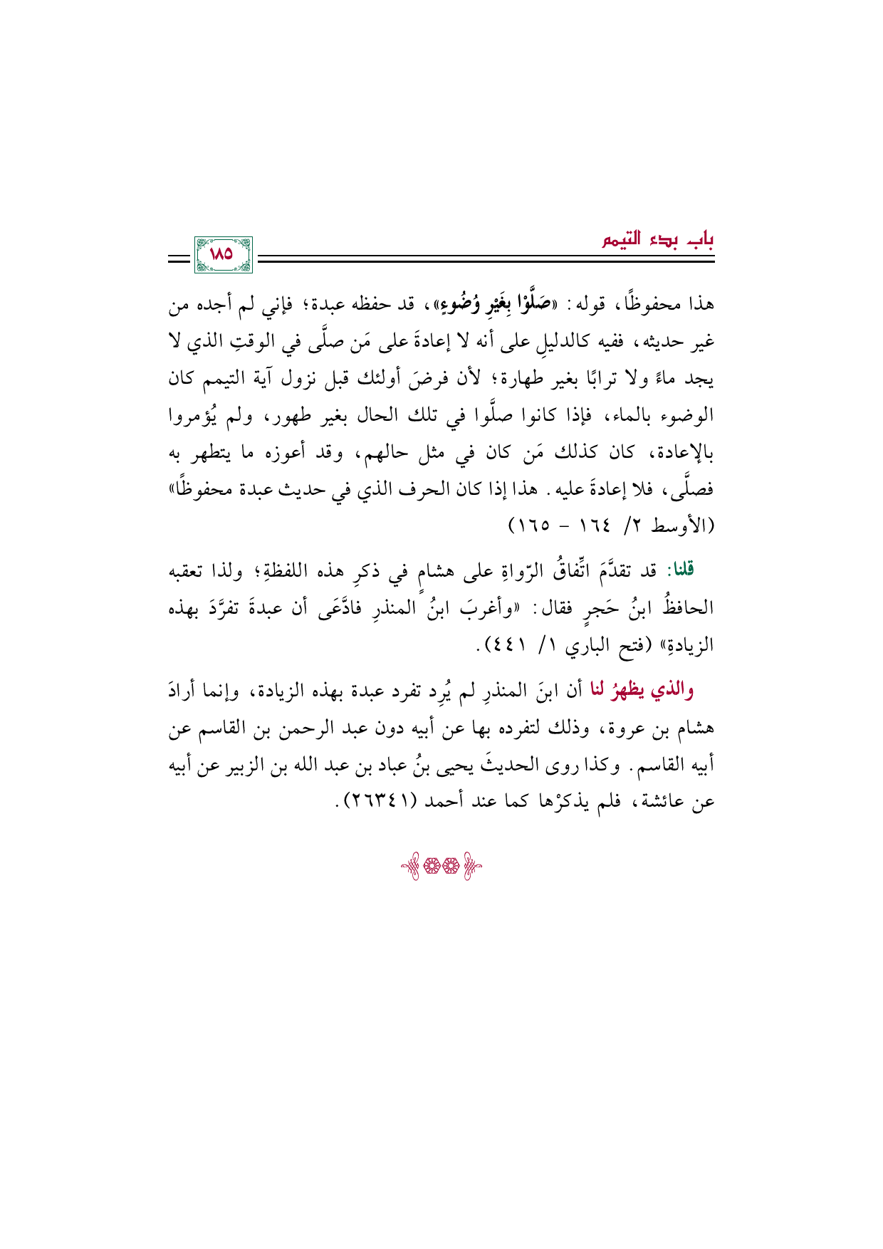 قلنا: قد تقدَّمَ اتِّفاقُ الرّواةِ على هشامٍ في ذكرِ هذه اللفظةِ؛ ولذا تعقبه الحافظُ ابنُ حَجرٍ فقال: "وأغربَ ابنُ المنذرِ فادَّعَى أن عبدةَ تفرَّدَ بهذه الزيادةِ" (فتح الباري ١/ ٤٤١).