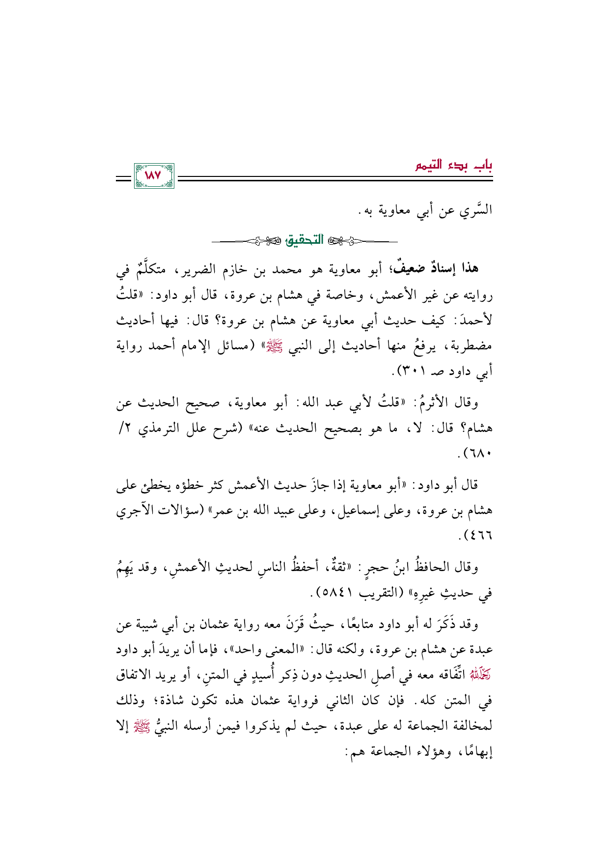 وقال الأثرمُ: "قلتُ لأبي عبد الله: أبو معاوية، صحيح الحديث عن هشام؟ قال: لا، ما هو بصحيح الحديث عنه" (شرح علل الترمذي ٢/ ٦٨٠).