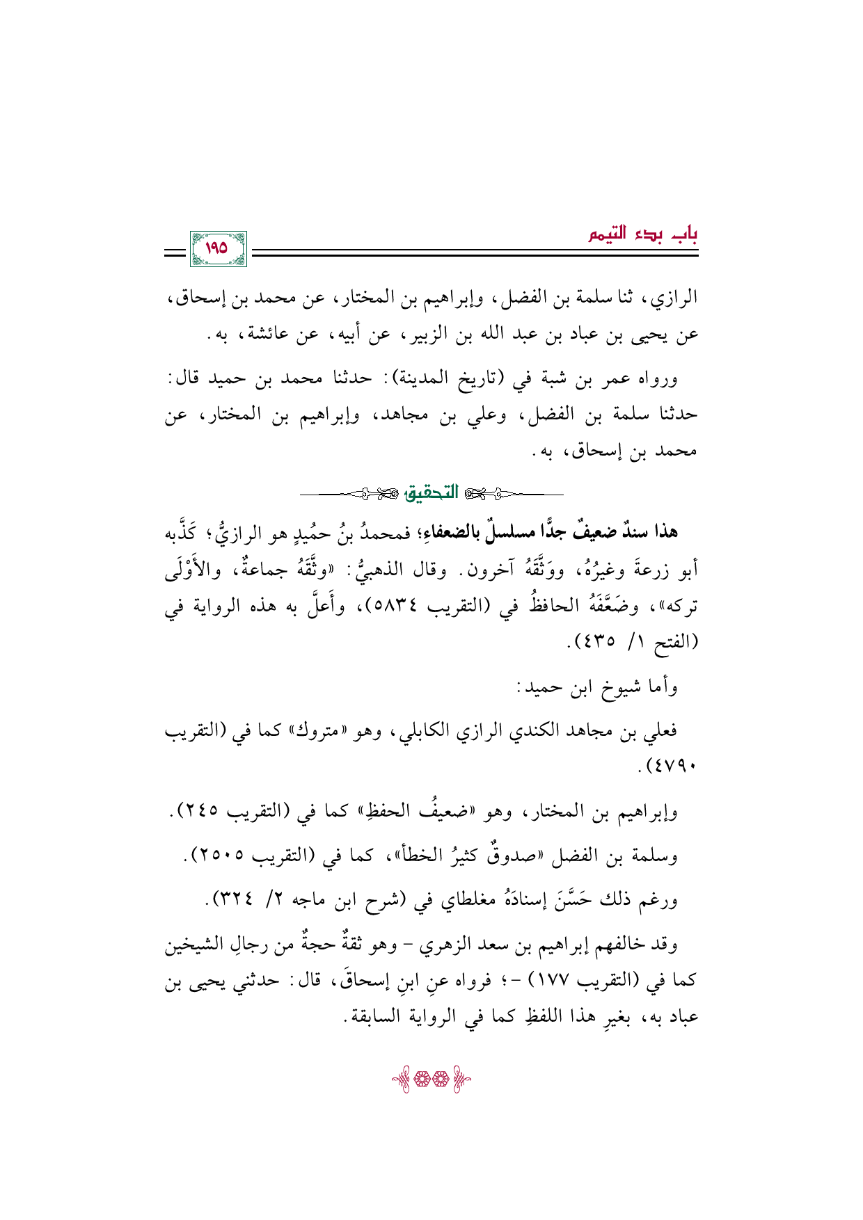 هذا سندٌ ضعيفٌ جدًّا مسلسلٌ بالضعفاءِ؛ فمحمدُ بنُ حمُيدٍ هو الرازيُّ؛ كَذَّبه أبو زرعةَ وغيرُهُ، ووَثَّقَهُ آخرون. وقال الذهبيُّ: "وثَّقَهُ جماعةٌ، والأَوْلَى تركه"، وضَعَّفَهُ الحافظُ في (التقريب ٥٨٣٤)، وأَعلَّ به هذه الرواية في (الفتح ١/ ٤٣٥).