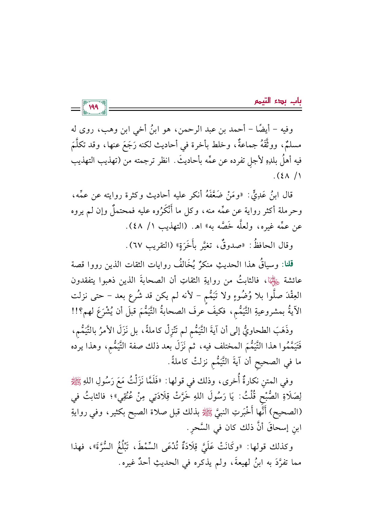 وفيه -أيضًا- أحمد بن عبد الرحمن، هو ابنُ أخي ابن وهب، روى له مسلمٌ، ووثَّقَهُ جماعةٌ، وخلط بأخرة في أحاديث لكنه رَجَعَ عنها، وقد تكلَّمَ فيه أهلُ بلدِهِ لأجلِ تفرده عن عمِّه بأحاديثَ. انظر ترجمته من (تهذيب التهذيب ١/ ٤٨).