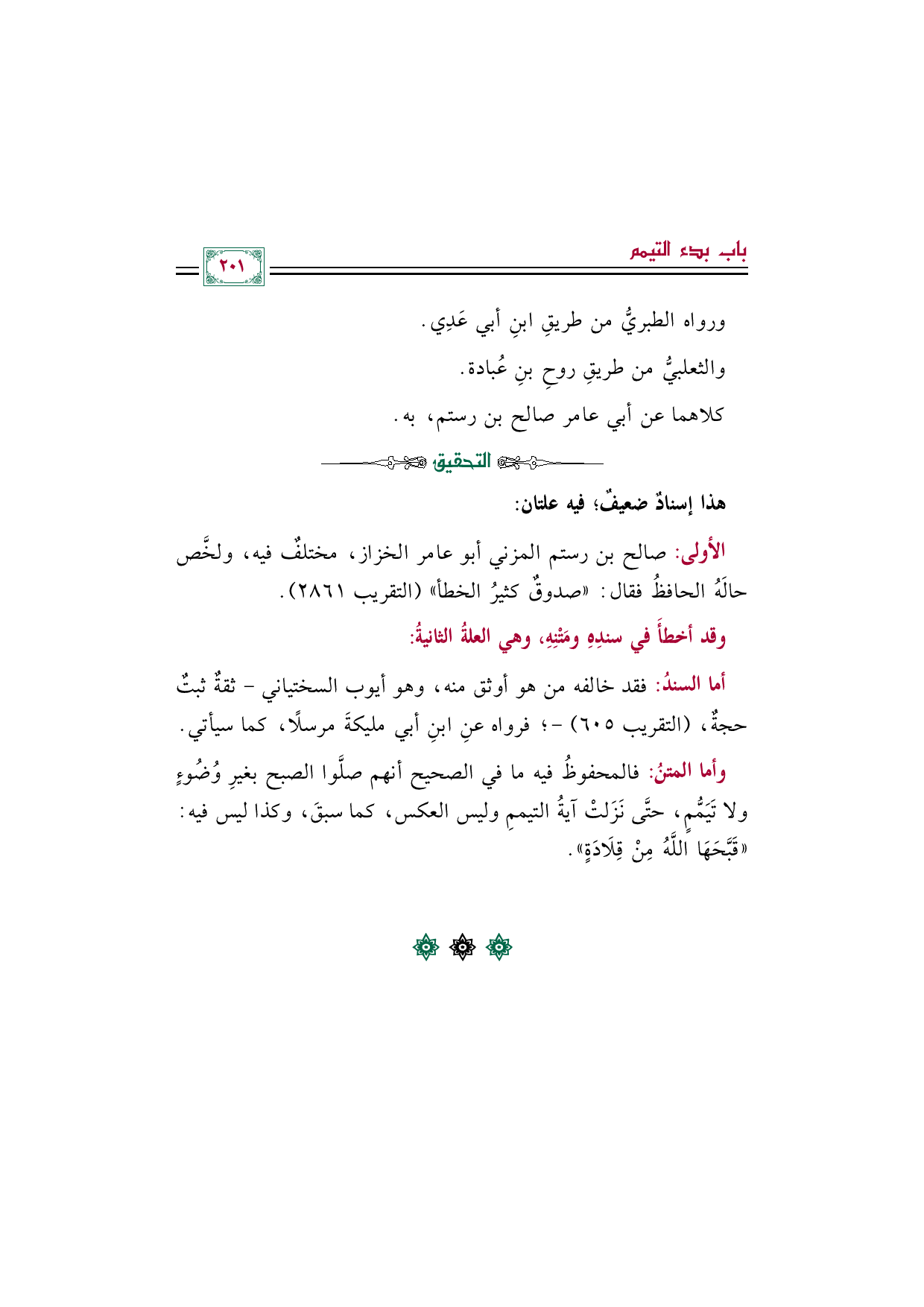 الأولى: صالح بن رستم المزني أبو عامر الخزاز، مختلفٌ فيه، ولخَّص حالَهُ الحافظُ فقال: "صدوقٌ كثيرُ الخطأ" (التقريب ٢٨٦١).