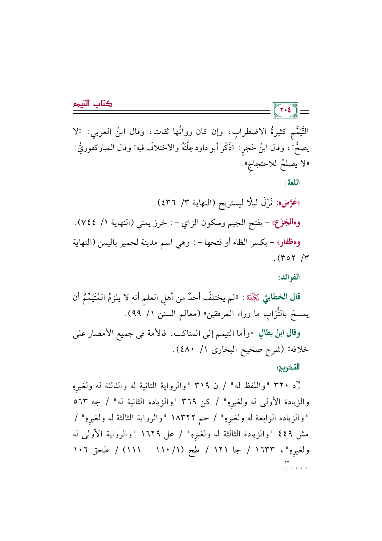 التَّيَمُّمِ كثيرةُ الاضطرابِ، وإن كان رواتُها ثقات، وقال ابنُ العربي: "لا يصحُّ"، وقال ابنُ حَجرٍ: "ذَكَر أبو داود عِلَّتَهُ والاختلافَ فيه" وقال المباركفوريُّ: "لا يصلحُ للاحتجاجِ".