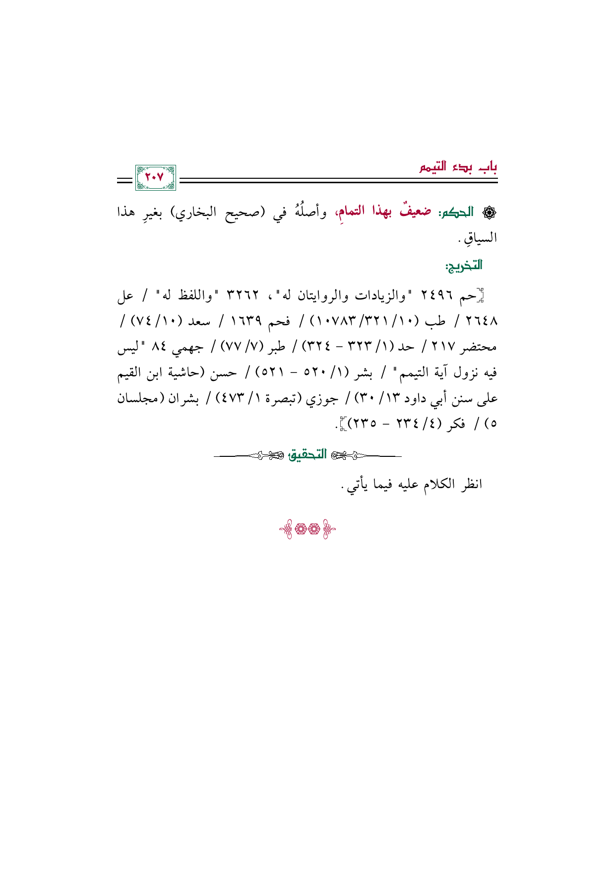 [حم ٢٤٩٦ (والزيادات والروايتان له)، ٣٢٦٢ (واللفظ له) / عل ٢٦٤٨/ طب (١٠/ ٣٢١/ ١٠٧٨٣) / فحم ١٦٣٩/ سعد (١٠/ ٧٤) / محتضر ٢١٧/ حد (١/ ٣٢٣ - ٣٢٤) / طبر (٧/ ٧٧) / جهمي ٨٤ (ليس فيه نزول آية التيمم) / بشر (١/ ٥٢٠ - ٥٢١) / حسن (حاشية ابن القيم على سنن أبي داود ١٣/ ٣٠) / جوزي (تبصرة ١/ ٤٧٣) / بشران (مجلسان ٥) / فكر (٤/ ٢٣٤ - ٢٣٥)].