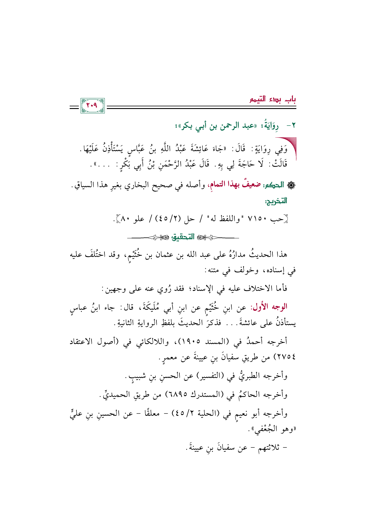 الوجه الأول: عن ابنِ خُثَيْمٍ عن ابنِ أبي مُلَيكَةَ، قال: جاء ابنُ عباسٍ يستأذنُ على عائشةَ ... فذكرَ الحديثَ بلفظِ الروايةِ الثانيةِ.