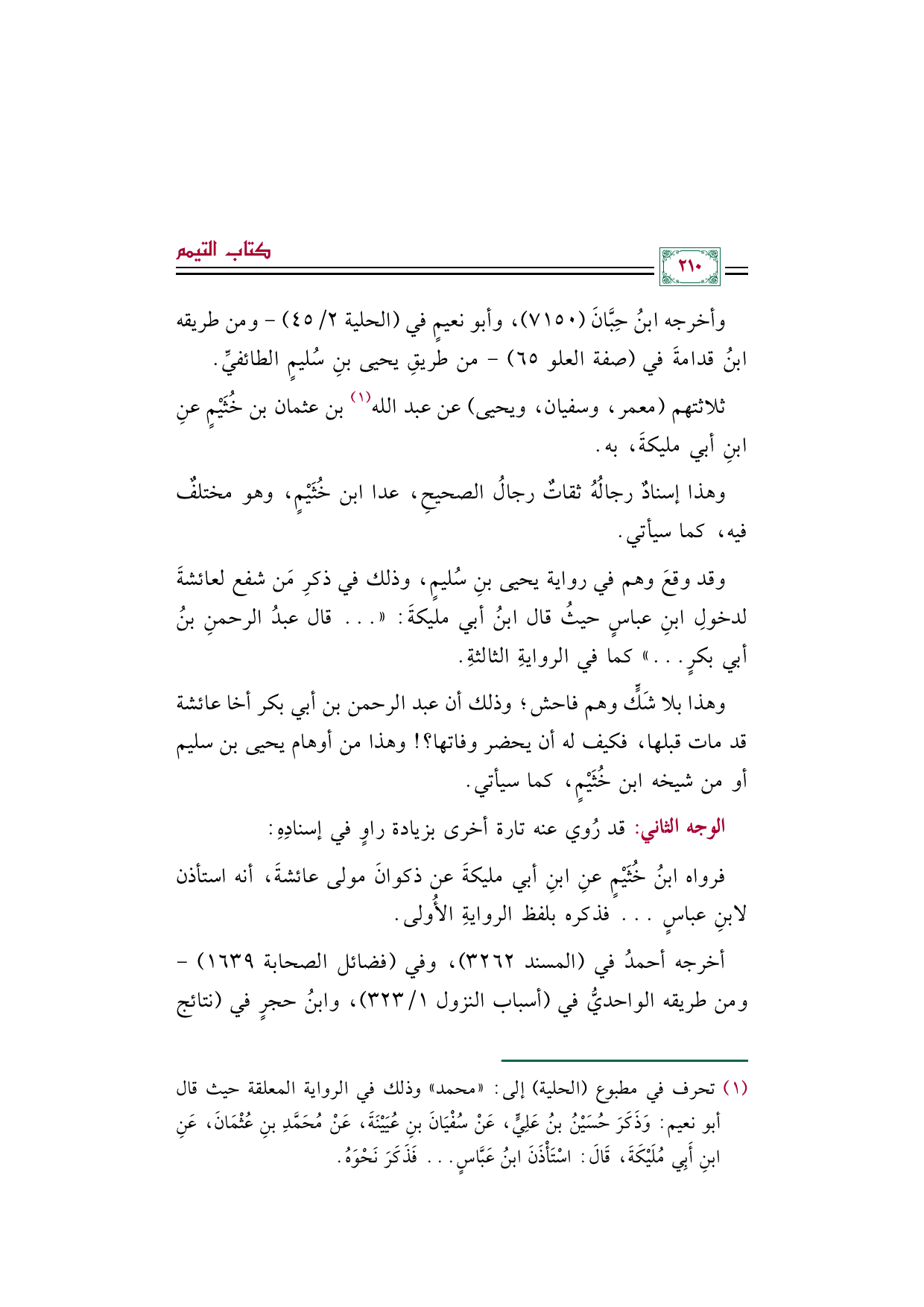 وقد وقعَ وهم في رواية يحيى بنِ سُليمٍ، وذلك في ذكرِ مَن شفع لعائشةَ لدخولِ ابنِ عباسٍ حيثُ قال ابنُ أبي مليكةَ: " ... قال عبدُ الرحمنِ بنُ أبي بكرٍ ... " كما في الروايةِ الثالثةِ.