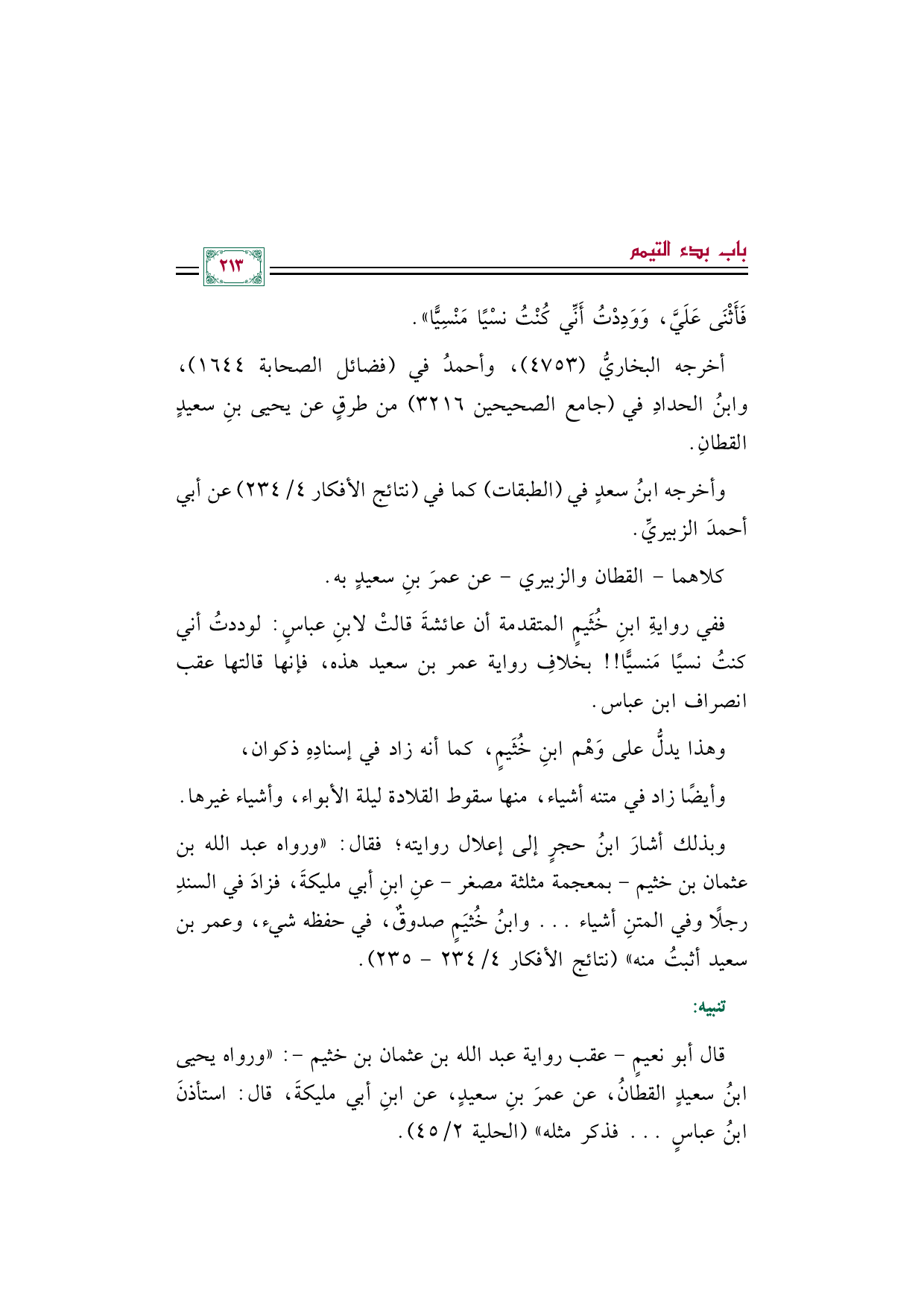 قال أبو نعيمٍ -عقب رواية عبد الله بن عثمان بن خثيم-: "ورواه يحيى بنُ سعيدٍ القطانُ، عن عمرَ بنِ سعيدٍ، عن ابنِ أبي مليكةَ، قال: استأذنَ ابنُ عباسٍ ... فذكر مثله" (الحلية ٢/ ٤٥).