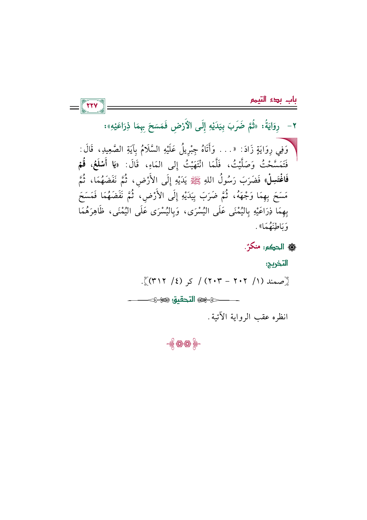 رِوَايَةُ ثُمَّ ضَرَبَ بِيَدَيْهِ إِلَى الأَرْضِ فَمَسَحَ بِهِمَا ذِرَاعَيْهِ