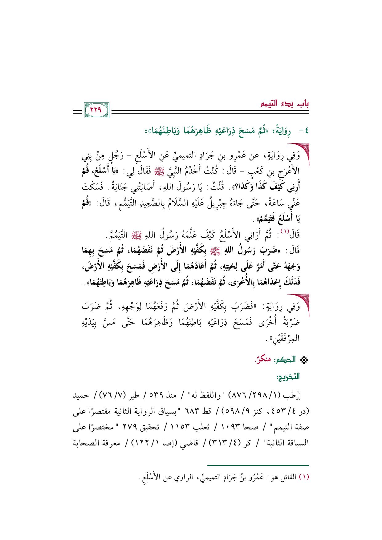 • وَفِي رِوَايَةٍ، عن عَمْرِو بنِ جَرَادٍ التميميِّ عَنِ الأَسْلَعِ -رَجُلٍ مِنْ بِنِي الأَعْرَجِ بنِ كَعْبٍ- قَالَ: كُنْتُ أَخْدُمُ النَّبِيَّ صلى الله عليه وسلم فَقَالَ لِي: ((يَا أَسْلَعُ، قُمْ أَرِنِي كَيْفَ كَذَا وَكَذا؟)). قُلْتُ: يَا رَسُولَ اللهِ، أَصَابَتْنِي جَنَابَةٌ. فَسَكَتَ عَنِّي سَاعَةً، حَتَّى جَاءَهُ جِبْرِيلُ عَلَيْهِ السَّلَامُ بِالصَّعِيدِ التَّيَمُّمِ، قَالَ: ((قُمْ يَا أَسْلَعُ فَتَيَمَّمْ)).