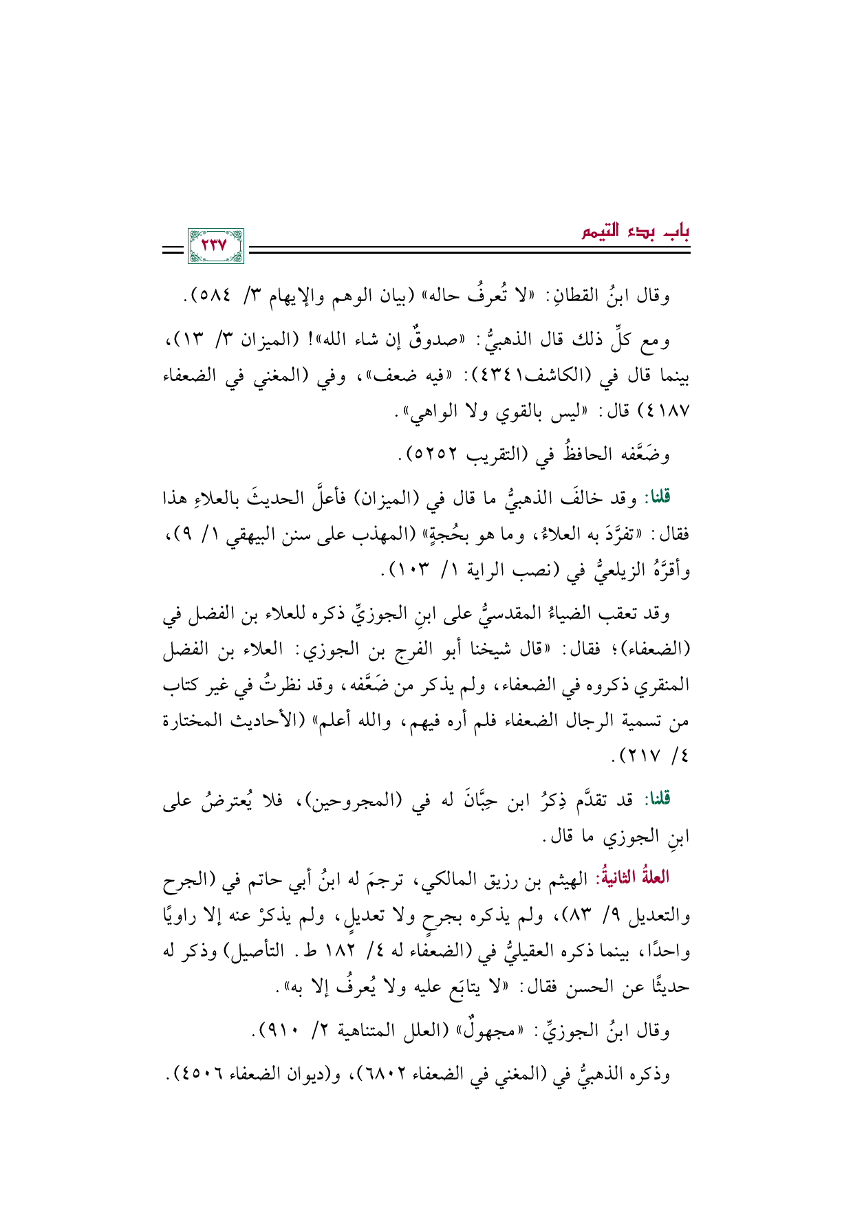 قلنا: وقد خالفَ الذهبيُّ ما قال في (الميزان) فأعلَّ الحديثَ بالعلاءِ هذا فقال: "تفرَّدَ به العلاءُ، وما هو بحُجةٍ" (المهذب على سنن البيهقي ١/ ٩)، وأقرَّهُ الزيلعيُّ في (نصب الراية ١/ ١٠٣).