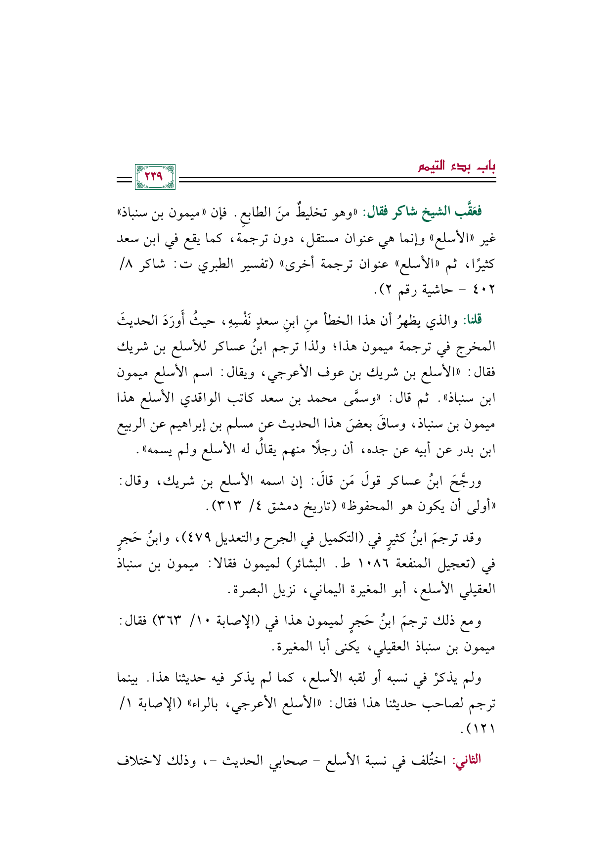فعَقَّب الشيخ شاكر فقال: "وهو تخليطٌ منَ الطابعِ. فإن "ميمون بن سنباذ" غير"الأسلع" وإنما هي عنوان مستقل، دون ترجمة، كما يقع في ابن سعد كثيرًا، ثم "الأسلع" عنوان ترجمة أخرى" (تفسير الطبري ت: شاكر ٨/ ٤٠٢ - حاشية رقم ٢).