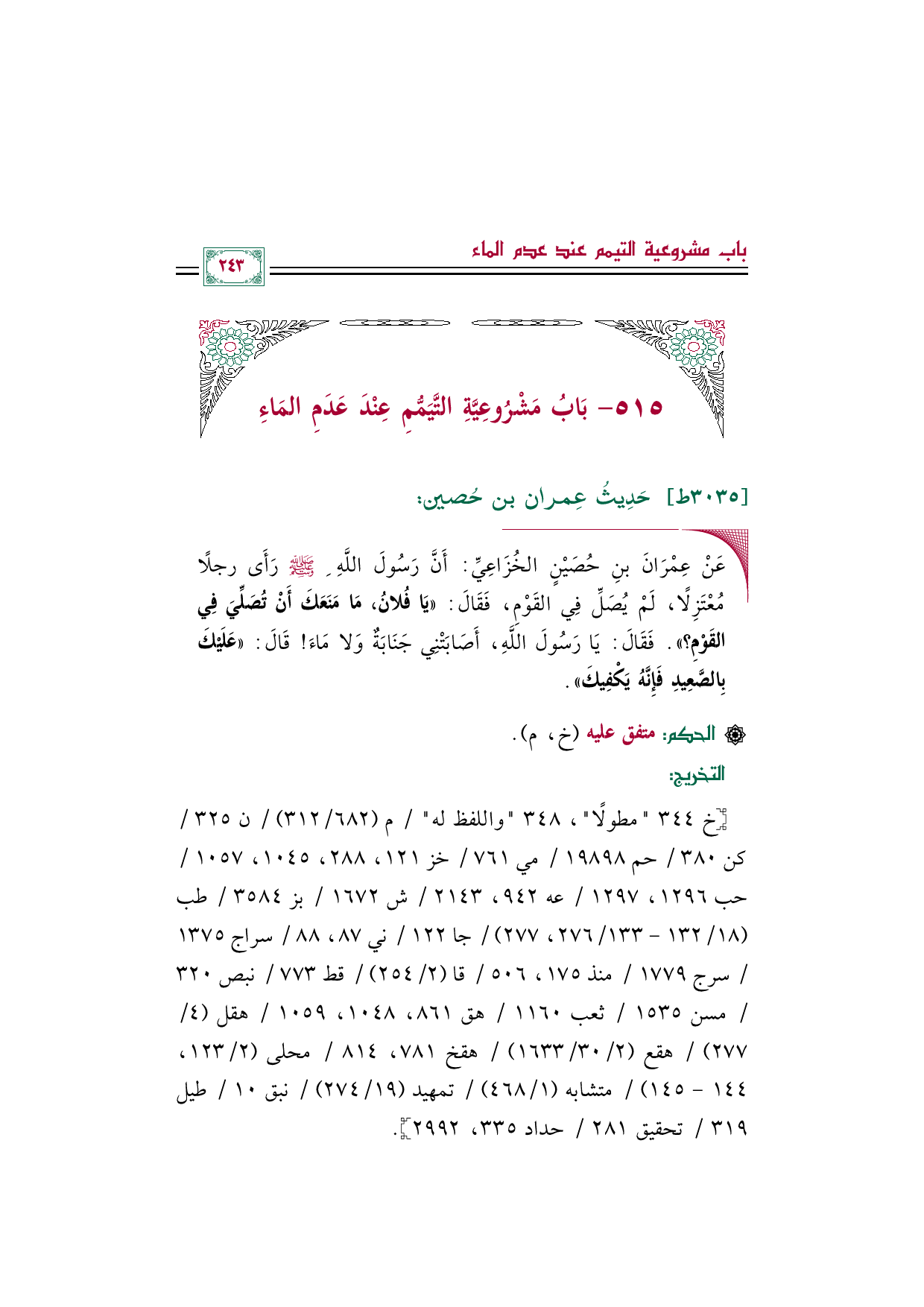 ◼ عَنْ عِمْرَانَ بنِ حُصَيْنٍ الخُزَاعِيِّ: أَنَّ رَسُولَ اللَّهِ صلى الله عليه وسلم رَأَى رجلًا مُعْتَزِلًا، لَمْ يُصَلِّ فِي القَوْمِ، فَقَالَ: ((يَا فُلانُ، مَا مَنَعَكَ أَنْ تُصَلِّيَ فِي القَوْمِ؟ )). فَقَالَ: يَا رَسُولَ اللَّهِ، أَصَابَتْنِي جَنَابَةٌ وَلا مَاءَ! قَالَ: ((عَلَيْكَ بِالصَّعِيدِ فَإِنَّهُ يَكْفِيكَ)).