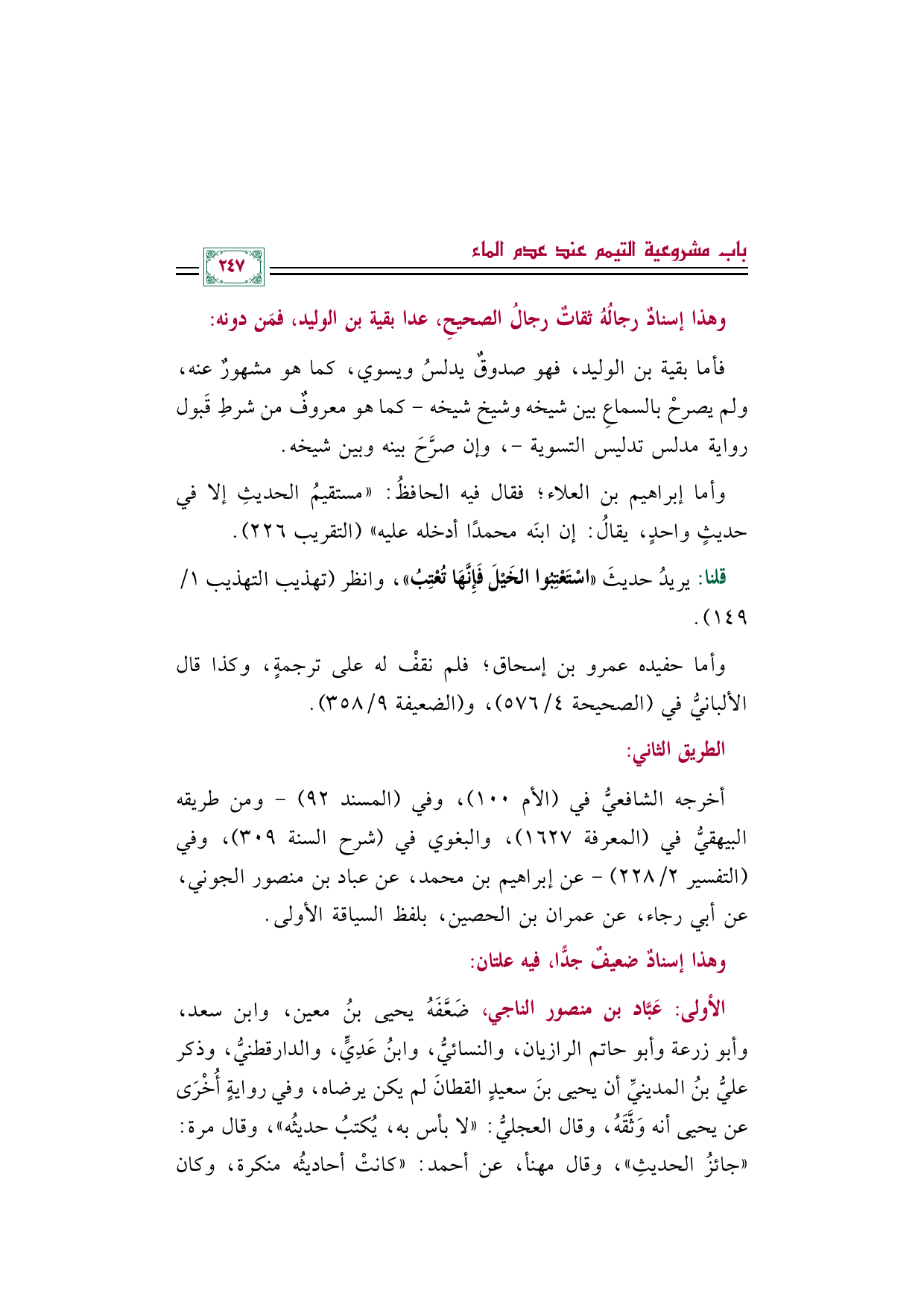 فأما بقية بن الوليد، فهو صدوقٌ يدلسُ ويسوي، كما هو مشهورٌ عنه، ولم يصرحْ بالسماعِ بين شيخه وشيخ شيخه -كما هو معروفٌ من شرطِ قَبول رواية مدلس تدليس التسوية-، وإن صرَّحَ بينه وبين شيخه.