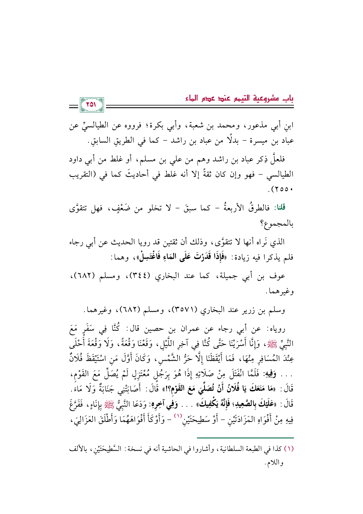 روياه: عن أبي رجاء عن عمران بن حصين قال: كُنَّا فِي سَفَرٍ مَعَ النَّبِيِّ صلى الله عليه وسلم، وَإِنَّا أَسْرَيْنَا حَتَّى كُنَّا فِي آخِرِ اللَّيْلِ، وَقَعْنَا وَقْعَةً، وَلَا وَقْعَةَ أَحْلَى عِنْدَ المُسَافِرِ مِنْهَا، فَمَا أَيْقَظَنَا إِلَّا حَرُّ الشَّمْسِ، وَكَانَ أَوَّلَ مَنِ اسْتَيْقَظَ فُلَانٌ ... وَفِيهِ: فَلَمَّا انْفَتَلَ مِنْ صَلَاتِهِ إِذَا هُوَ بِرَجُلٍ مُعْتَزِلٍ لَمْ يُصَلِّ مَعَ القَوْمِ، قَالَ: ((مَا مَنَعَكَ يَا فُلَانُ أَنْ تُصَلِّيَ مَعَ القَوْمِ؟ ! )) قَالَ: أَصَابَتْنِي جَنَابَةٌ وَلَا مَاءَ. قَالَ: ((عَلَيْكَ بِالصَّعِيدِ؛ فَإِنَّهُ يَكْفِيكَ)) ... وَفِي آخِرِهِ: وَدَعَا النَّبِيُّ صلى الله عليه وسلم بِإِنَاءٍ، فَفَرَّغَ فِيهِ مِنْ أَفْوَاهِ المَزَادَتَيْنِ -أَوْ سَطِيحَتَيْنِ (¬١) - وَأَوْكَأَ أَفْوَاهَهُمَا وَأَطْلَقَ العَزَالِيَ،