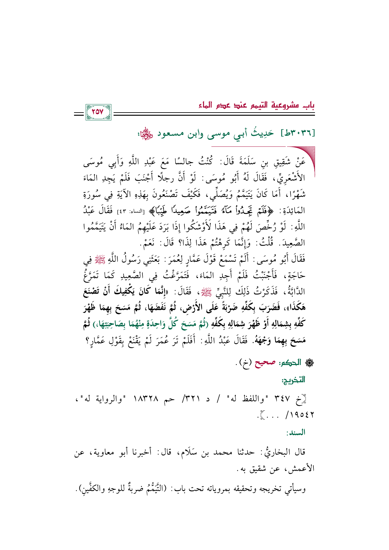 ◼ عَنْ شَقِيقِ بنِ سَلَمَةَ قَالَ: كُنْتُ جالسًا مَعَ عَبْدِ اللَّهِ وَأَبِي مُوسَى الأَشْعَرِيِّ، فَقَالَ لَهُ أَبُو مُوسَى: لَوْ أَنَّ رجلًا أَجْنَبَ فَلَمْ يَجِدِ المَاءَ شَهْرًا، أَمَا كَانَ يَتَيَمَّمُ وَيُصَلِّي، فَكَيْفَ تَصْنَعُونَ بِهَذِهِ الآيَةِ فِي سُورَةِ المَائِدَةِ: {فَلَمْ تَجِدُوا مَاءً فَتَيَمَّمُوا صَعِيدًا طَيِّبًا} [النساء: ٤٣] فَقَالَ عَبْدُ اللَّهِ: لَوْ رُخِّصَ لَهُمْ فِي هَذَا لَأَوْشَكُوا إِذَا بَرَدَ عَلَيْهِمُ المَاءُ أَنْ يَتَيَمَّمُوا الصَّعِيدَ. قُلْتُ: وَإِنَّمَا كَرِهْتُمْ هَذَا لِذَا؟ قَالَ: نَعَمْ.
