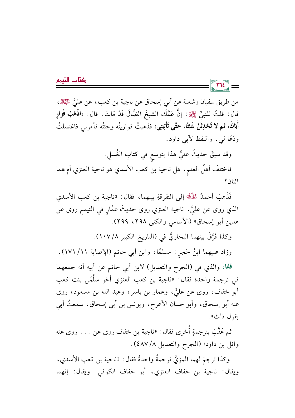 فَذَهبَ أحمدُ رحمه الله إلى التفرقةِ بينهما، فقال: "ناجية بن كعب الأسدي الذي روى عن عليٍّ، ناجية العنزي روى حديثَ عمَّارٍ في التيممِ روى عن هذين أبو إسحاق" (الأسامي والكنى ٢٩٨، ٢٩٩).