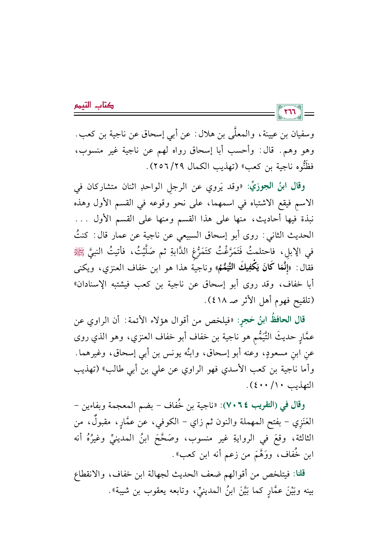 قال الحافظُ ابنُ حَجرٍ: "فيلخص من أقوال هؤلاء الأئمة: أن الراوي عن عمَّارٍ حديثَ التَّيَمُّمِ هو ناجية بن خفاف أبو خفاف العنزي، وهو الذي روى عنِ ابنِ مسعودٍ، وعنه أبو إسحاق، وابنُه يونس بن أبي إسحاق، وغيرهما. وأما ناجية بن كعب الأسدي فهو الراوي عن علي بن أبي طالب" (تهذيب التهذيب ١٠/ ٤٠٠).