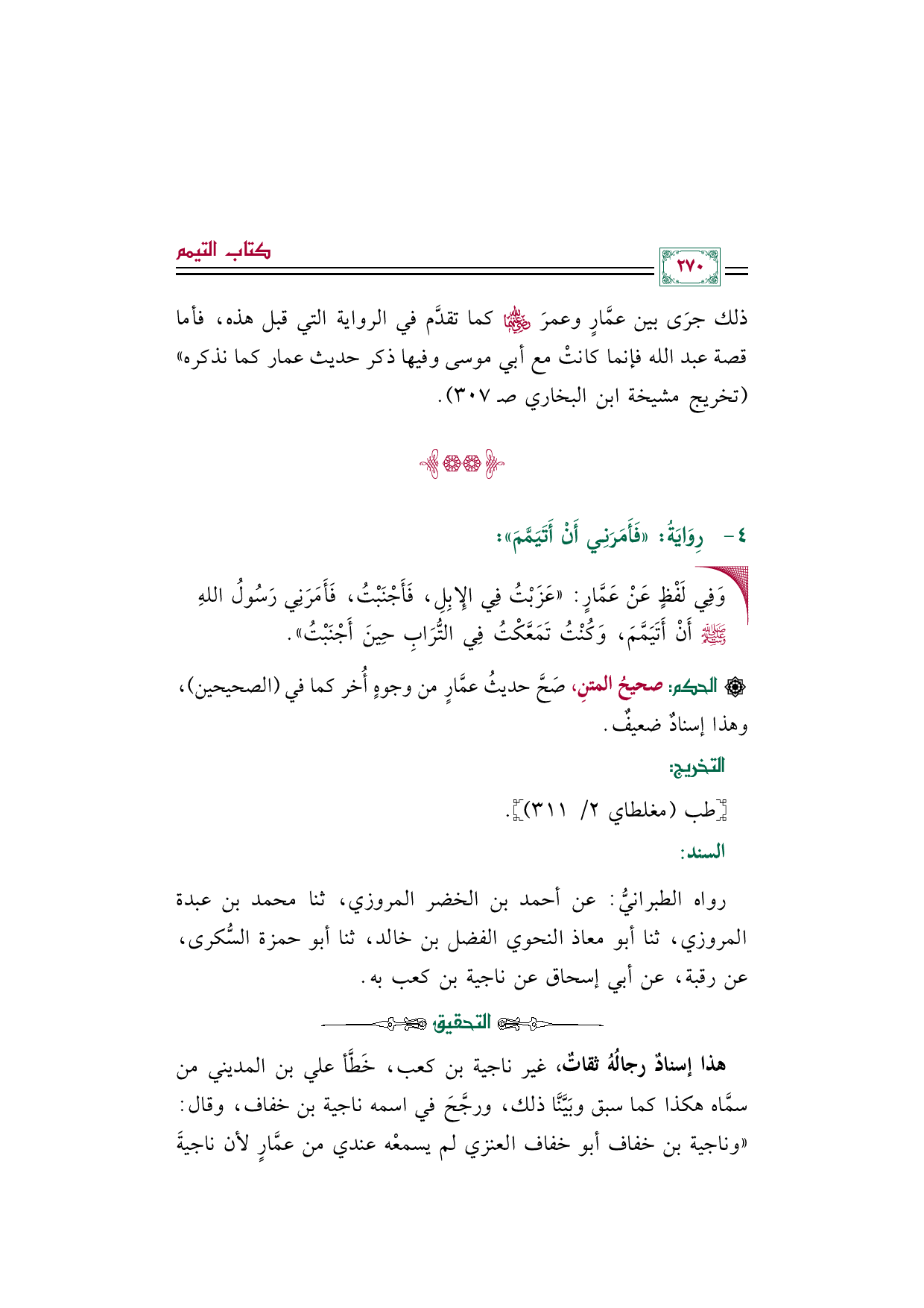 ذلك جرَى بين عمَّارٍ وعمرَ رضي الله عنهما كما تقدَّم في الرواية التي قبل هذه، فأما قصة عبد الله فإنما كانتْ مع أبي موسى وفيها ذكر حديث عمار كما نذكره" (تخريج مشيخة ابن البخاري صـ ٣٠٧).