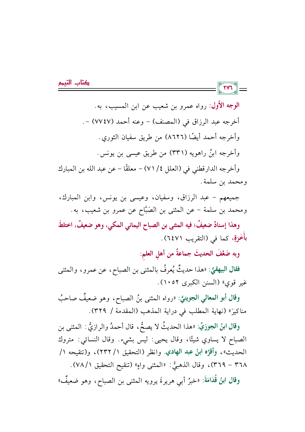 وقال أبو المعالي الجوينيُّ: "رواه المثنى بنُ الصباح، وهو ضعيفٌ صاحبُ مناكيرَ" (نهاية المطلب في دراية المذهب (المقدمة/ ٣٢٩).