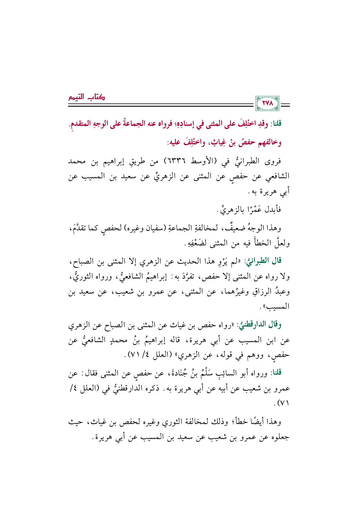 وقال الدارقطنيُّ: "رواه حفص بن غياث عن المثنى بن الصباح عن الزهري عن ابن المسيب عن أبي هريرة، قاله إبراهيمُ بنُ محمدٍ الشافعيُّ عن حفصٍ، ووهم في قوله، عن الزهري" (العلل ٤/ ٧١).