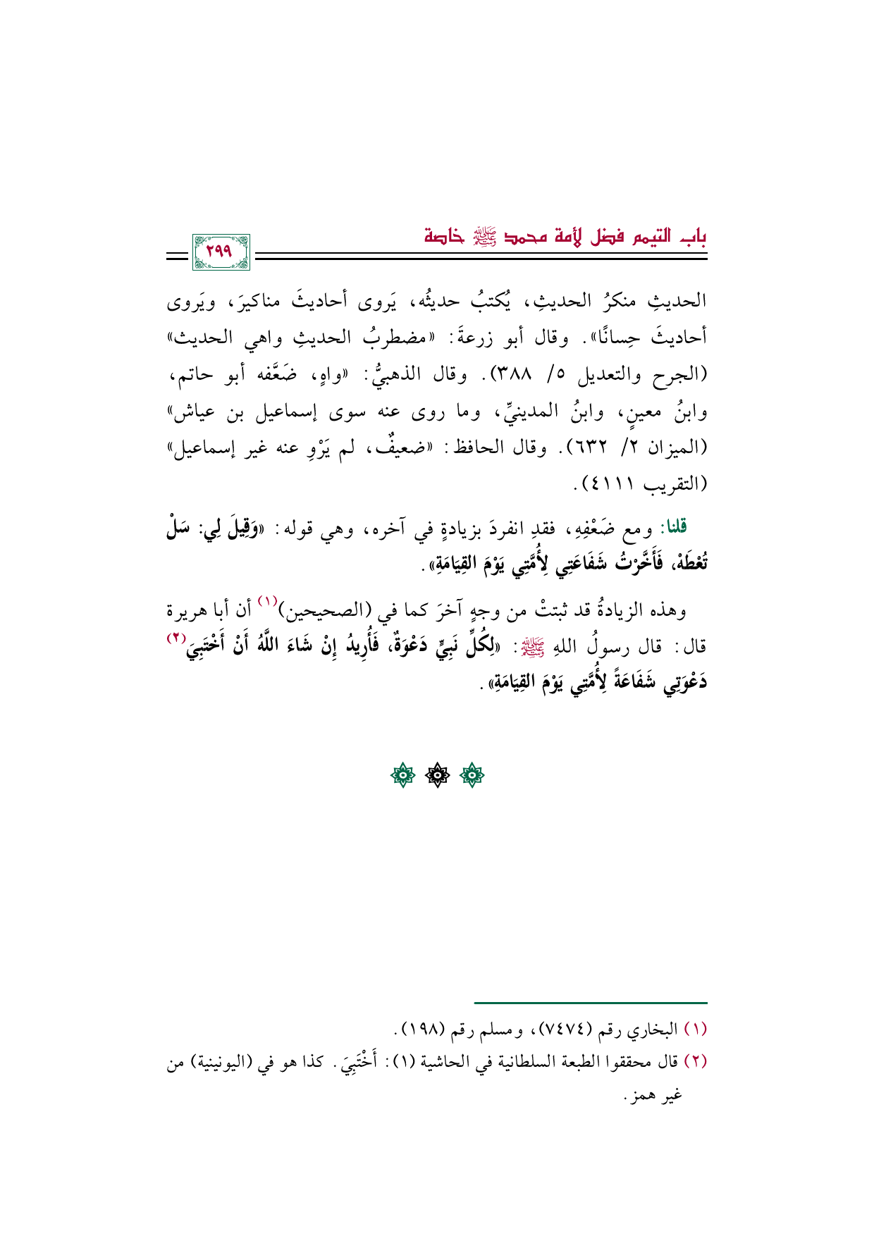 قلنا: ومع ضَعْفِهِ، فقدِ انفردَ بزيادةٍ في آخره، وهي قوله: ((وَقِيلَ لِي: سَلْ تُعْطَهْ، فَأَخَّرْتُ شَفَاعَتِي لِأُمَّتِي يَوْمَ القِيَامَةِ)).