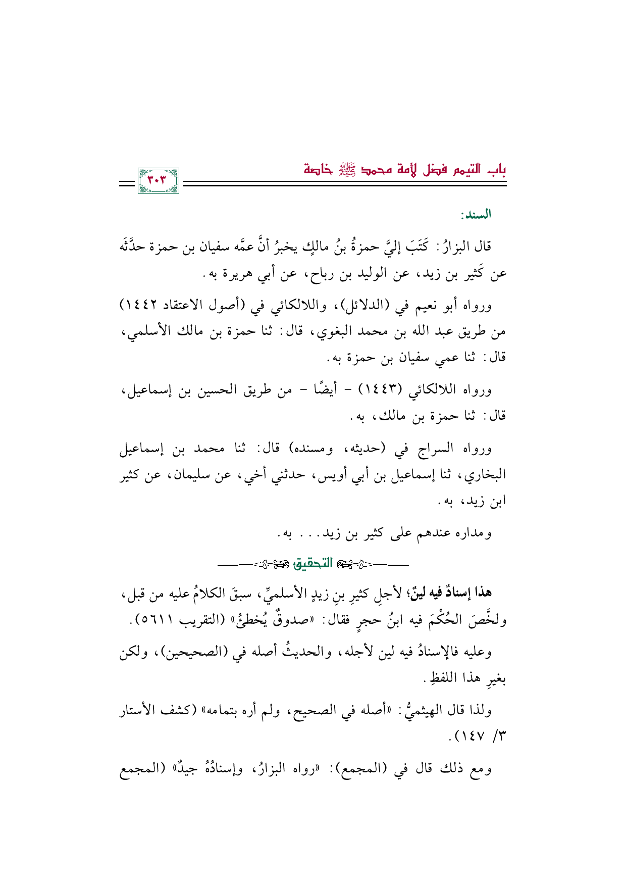 قال البزارُ: كَتَبَ إليَّ حمزةُ بنُ مالكٍ يخبرُ أنَّ عمَّه سفيان بن حمزة حدَّثَه عن كَثير بن زيد، عن الوليد بن رباح، عن أبي هريرة به.