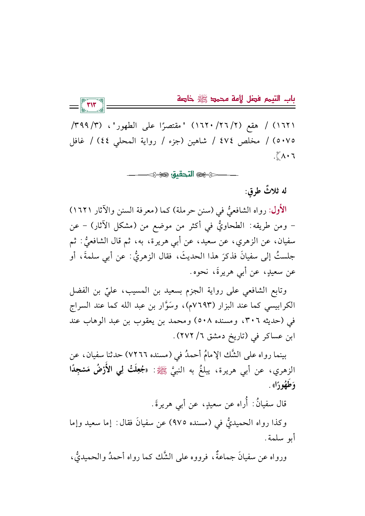 بينما رواه على الشَّك الإمامُ أحمدُ في (مسنده ٧٢٦٦) حدثنا سفيان، عن الزهري، عن أبي هريرة، يبلغُ به النبيَّ صلى الله عليه وسلم: ((جُعِلَتْ لِي الأَرْضُ مَسْجِدًا وَطَهُورًا)).