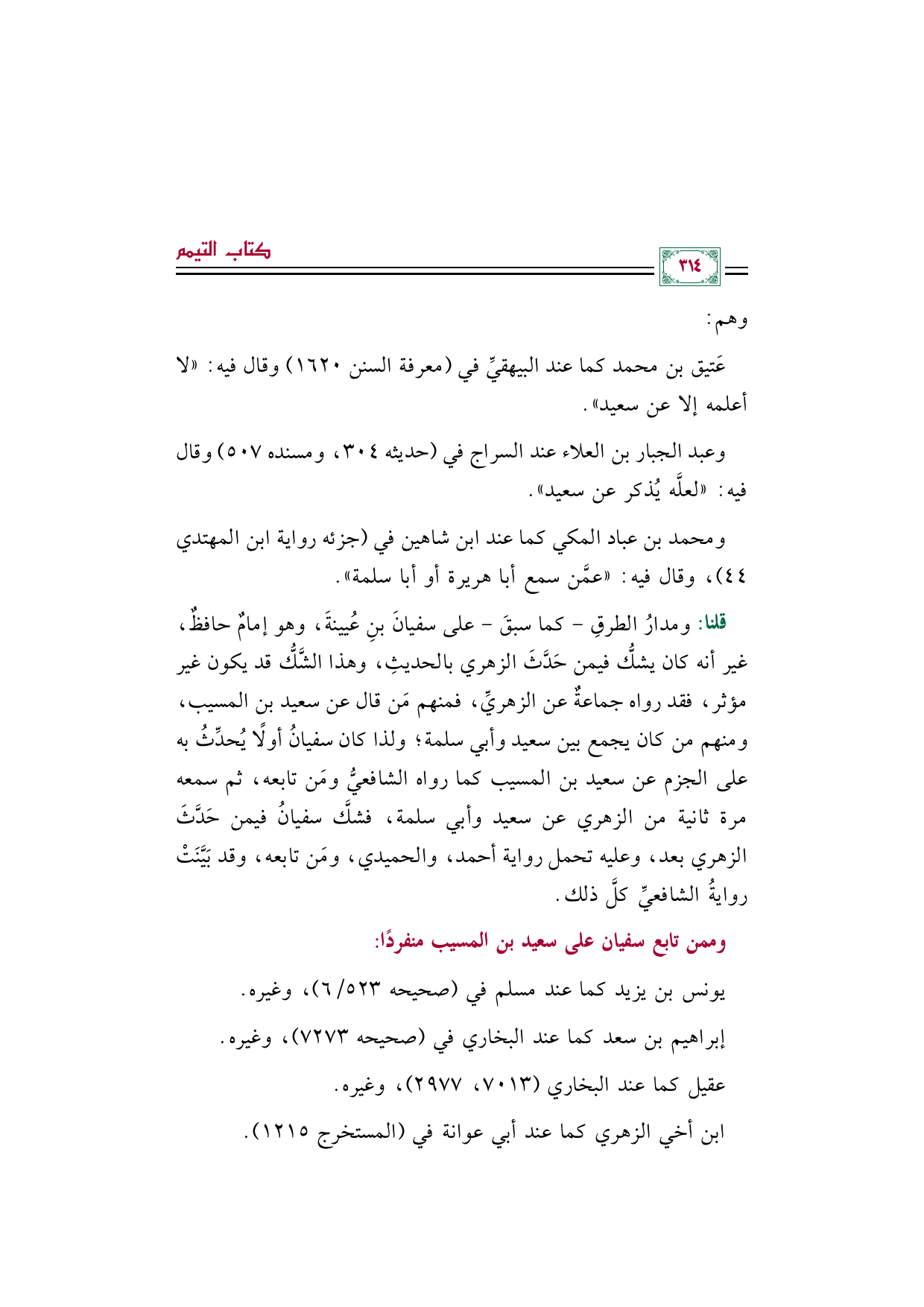 قلنا: ومدارُ الطرقِ -كما سبقَ- على سفيانَ بنِ عُيينةَ، وهو إمامٌ حافظٌ، غير أنه كان يشكُّ فيمن حَدَّثَ الزهري بالحديثِ، وهذا الشَّكُّ قد يكون غير مؤثر، فقد رواه جماعةٌ عن الزهريِّ، فمنهم مَن قال عن سعيد بن المسيب، ومنهم من كان يجمع بين سعيد وأبي سلمة؛ ولذا كان سفيانُ أولًا يُحدِّثُ به على الجزم عن سعيد بن المسيب كما رواه الشافعيُّ ومَن تابعه، ثم سمعه مرة ثانية من الزهري عن سعيد وأبي سلمة، فشكَّ سفيانُ فيمن حَدَّثَ الزهري بعد، وعليه تحمل رواية أحمد، والحميدي، ومَن تابعه، وقد بَيَّنَتْ روايةُ الشافعيِّ كلَّ ذلك.
